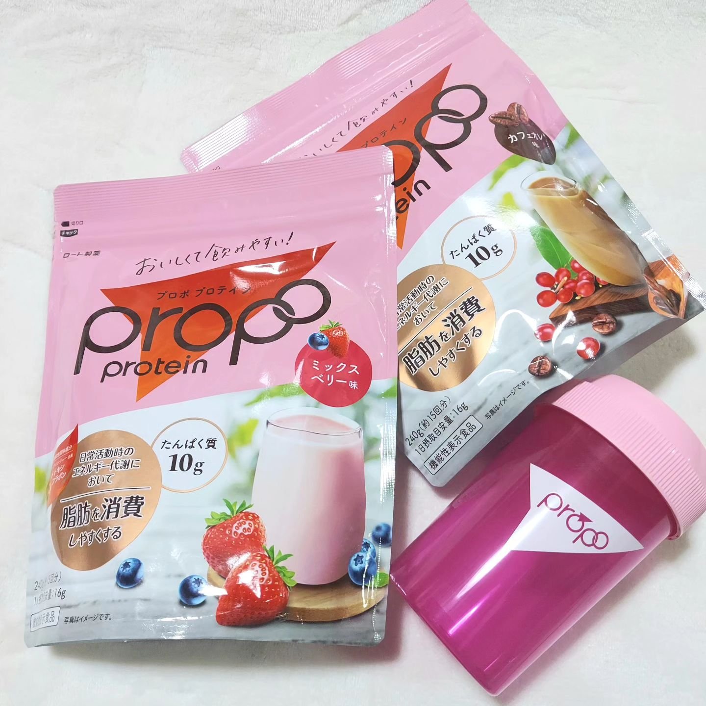 ロート製薬の「プロポプロテインミックスベリー味」は、Wの脂肪対策サポート成分※1を配合したプロテインドリンクです。※1 ブラックジンジャー由来ポリメトキシフラボンの研究報告によるなんでも、日常活動時に脂肪を消費しやすくして更にはBMIが高めの...