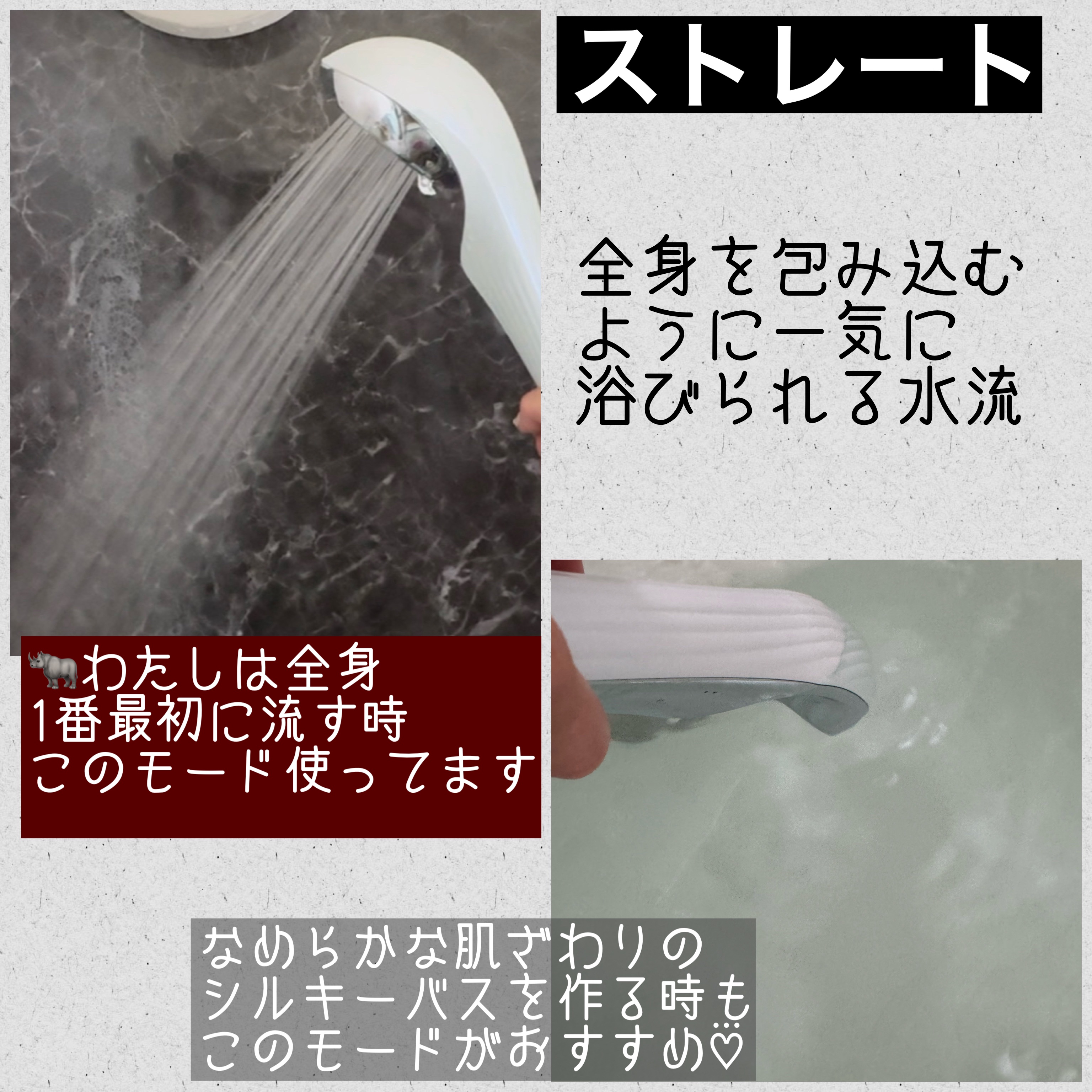 - ※2024年3月以降、順次保証書の仕様を変更(ギャランティーカード同封→QRコード添付へ)いたします。 ■部位に合わせて選べる4つのモード ● ミスト 驚くほどきめ細かく包まれるようなミストで、 ふんわりやさしく洗いあげます。顔などの刺激を避けたい敏感な部位に。 ● ポイントジェット ポイント放射で、もっとも水圧が高い水流。頭皮に使用すれば、爽快なヘッドスパのような体感を気軽に味わえます。 ● ピュアストレート ステンレス板から放射される、細かくて密度の高い水流。肌にやさしく、でもたっぷりと浴びたいときに。 ● ストレート 全身を包み込むように、一気に浴びられる水流。シルキーバスを素早くつくるときはこのモードで。