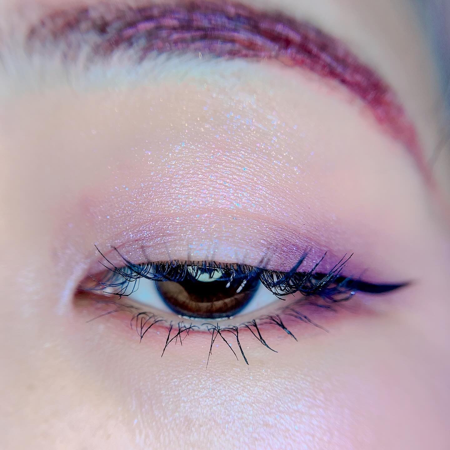 ベースに右上、目頭から黒目上に真ん中、黒目〜目尻に右下を、左上を目頭にくの字に塗ってもらいました✨ ピンクサクラよりもクールな感じで、目で見た色より私の肌では紫っぽく発色しました😍 上2つはラメはぎっしりでときめく💓 ブラウンメイクがとても苦手だけれどこれならブラウンメイク出来そう👌(かなり紫寄りですが) くすみ感は強いので苦手な方は厳しいかも…(特に真ん中) クールな印象になるので大人顔さん向けor大人顔になりたい方向けのイメージです✨