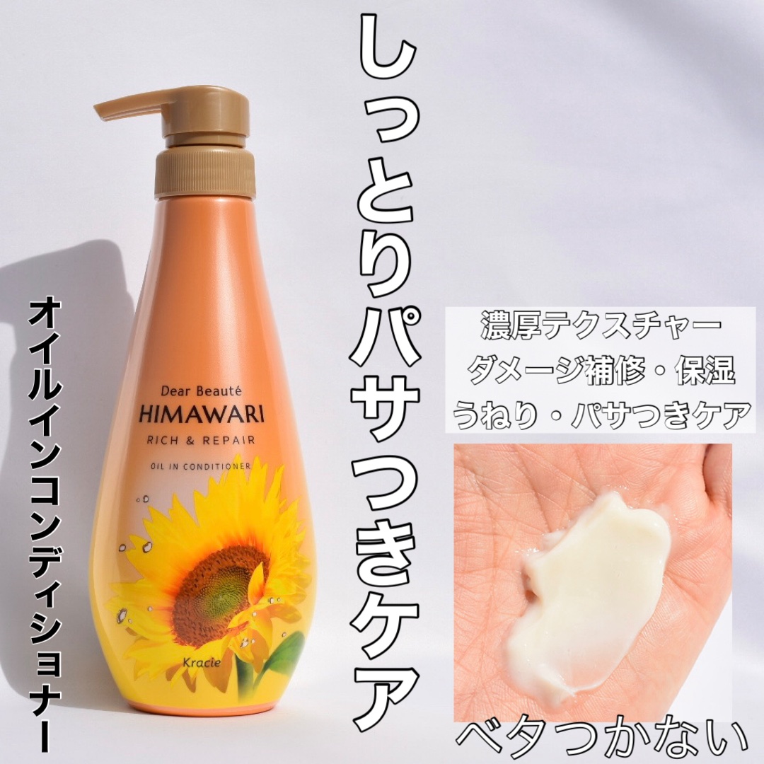 ヒマワリが描かれたピンクの鮮やかなホトル♪ ヒマワリの花びらを逆さまにしたような形がかわいらしいです〜🌻 うるおいくツヤアップ⤴︎ うねり、くせ、パサつき湿気やブラッシングなどによるひっぱりダメージもケアしてくれるのがうれしい♡ 泡立ち良く洗い上げてくれて "つやん"と"すとんっ"とまとまる髪に仕上げてくれました✨