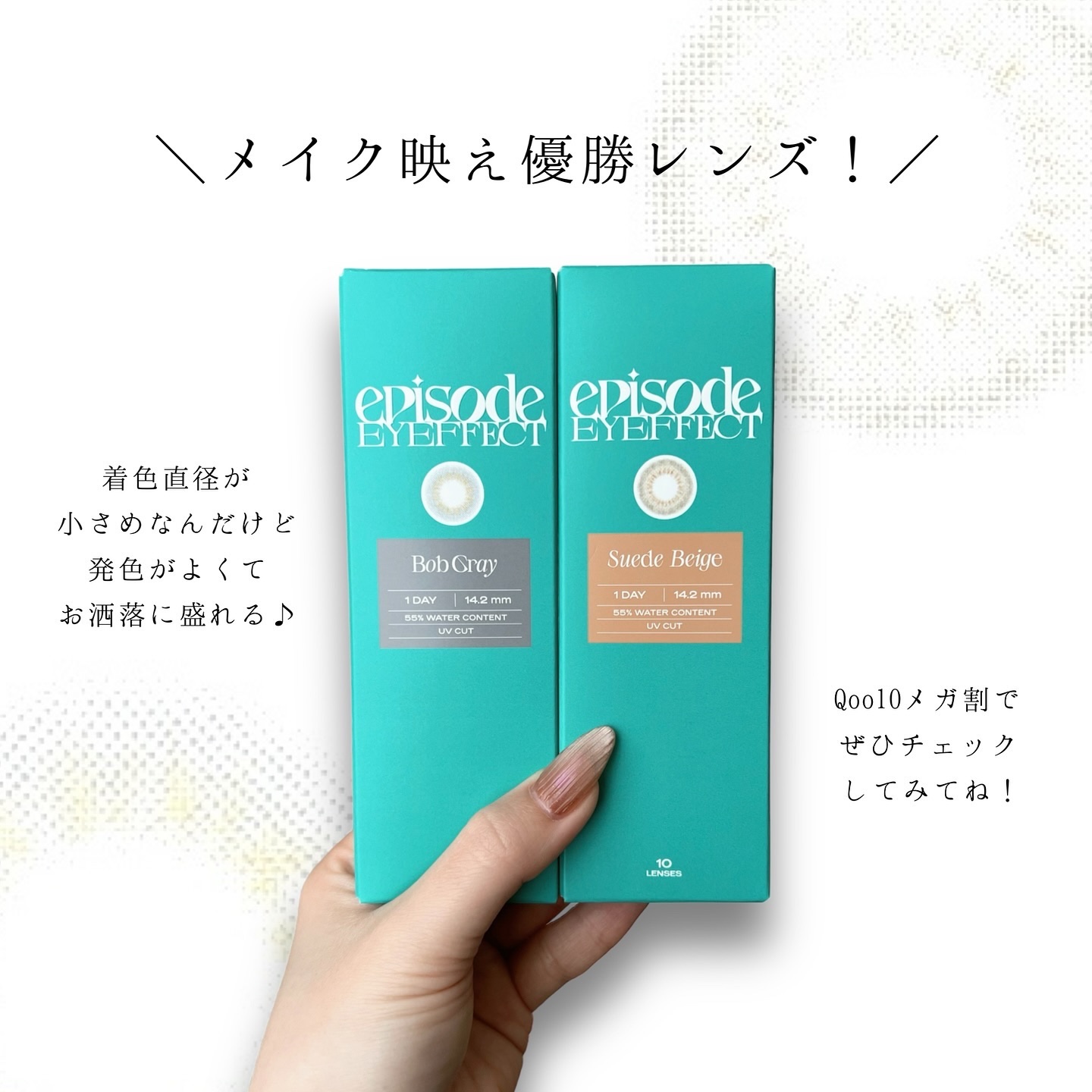 - 『episode EYEFFECT(エピソード アイフェクト)』はファッションやメイクに合わせて印象を変えて楽しみつつも自然に瞳に馴染むレンズを目指したカラーコンタクトレンズブランドです。 ファッショニスタとしても多くのファンを抱える須田アンナ/YURINOならではの、誰でもオシャレに盛れるカラコンが誕生しました。 スエードベージュ レンズ:BC8.6mm、DIA14.2mm、着色直径12.4mm、含水率55%、UVカット ボブグレー レンズ:BC8.6mm、DIA14.2mm、着色直径13.0mm、含水率55%、UVカット 2024年6月1日(土)よりQoo10メガ割にて先行発売