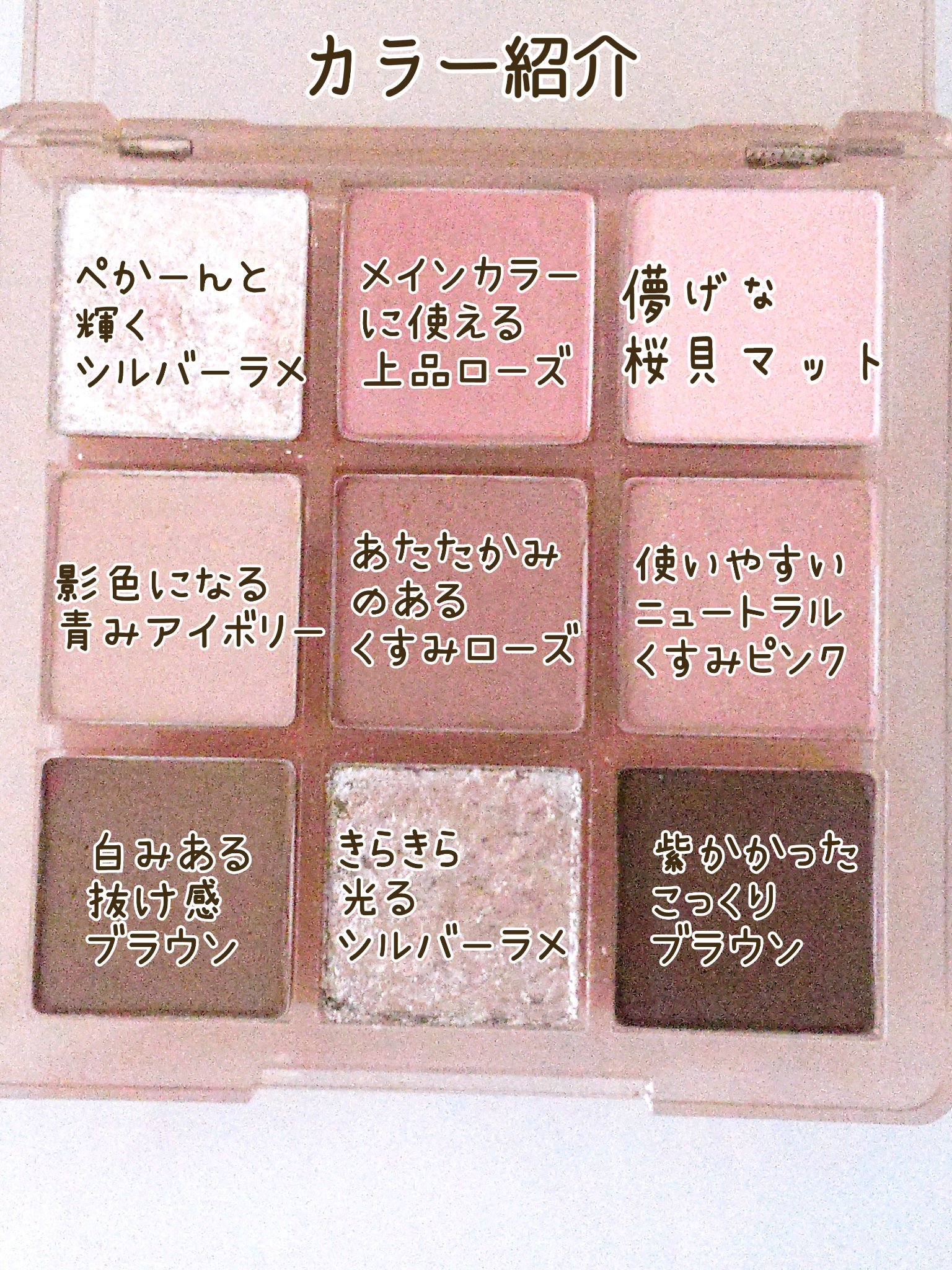 - 似合うが見つかる。ぴったり色シャドウ 捨て色なしで、馴染む影感 ■肌に馴染みやすいカラーで、重ねるほどに自然な陰影 多彩な9色のカラーで、影感もハイライトも自由自在。 厚塗り感の出にくいパウダーだから、柔らかく発色し、透明感のある印象の目元を演出。 ■高密着パウダー 目元の油分を抑えるソフトなパウダーだから、粉飛びしづらく、ヨレにくい。 グリッターもマットもクリーミーな質感で、優しく目元を彩る。