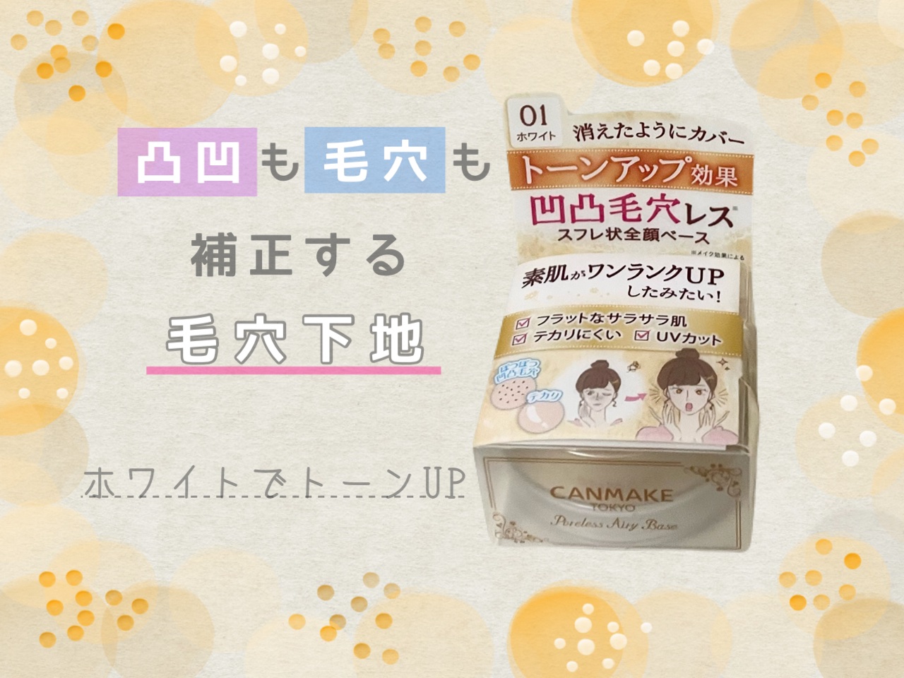 キャンメイクポアレスエアリーベース01ピュアホワイト02ナチュラルベージュキャンメイクさんのポアレスエアリーベースの紹介です。✨【使った商品】キャンメイクポアレスエアリーベース01ピュアホワイト02ナチュラルベージュ【商品の特徴】数センチ円形...