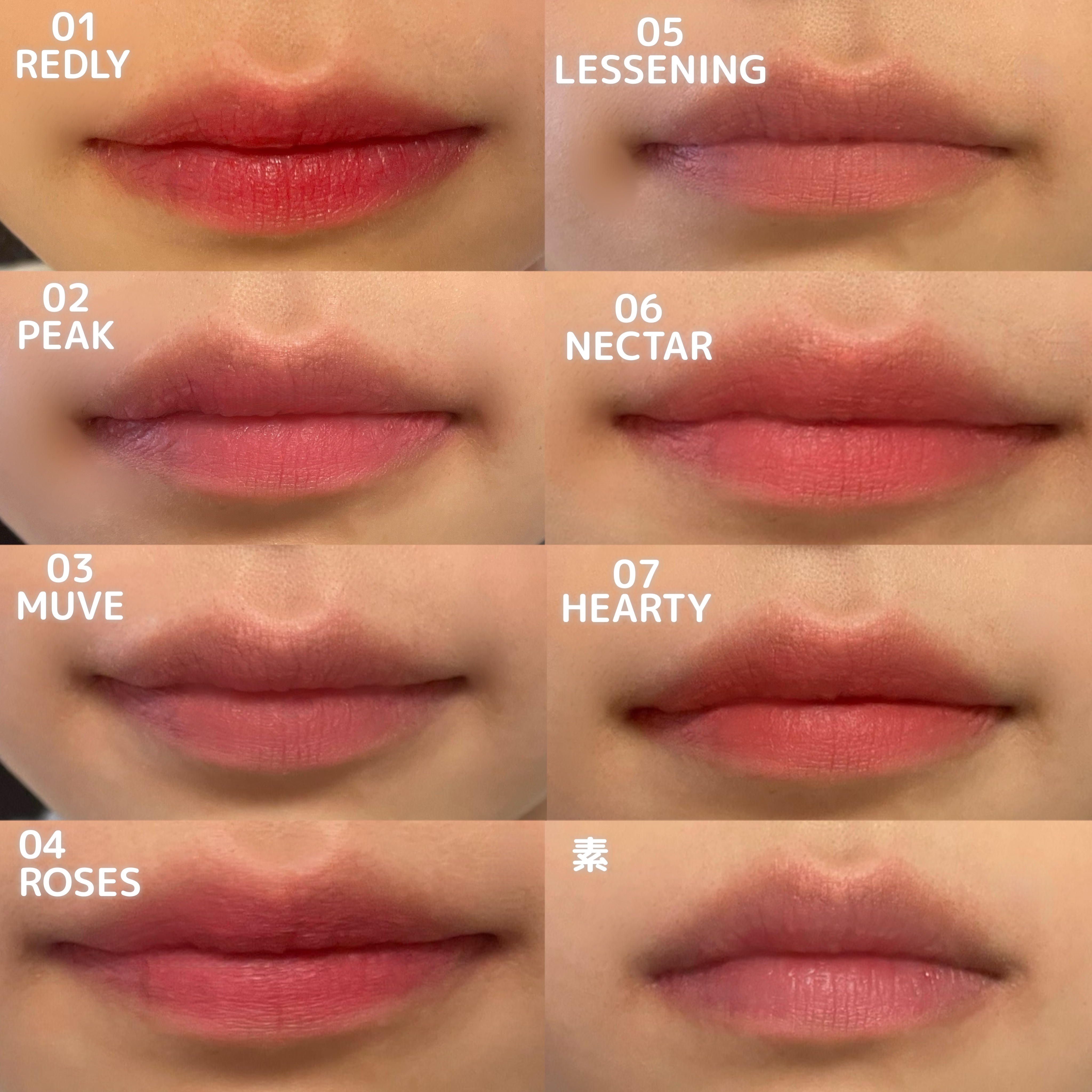- <02 PEAK(ピーク)> ジメチコン、ジメチコンクロスポリマー、シリカ、イソノナン酸イソノニル、パラフィン、合成フルオロフロゴパイト、リンゴ酸ジイソステアリル、酸化チタン、リンゴ種子油、トリイソステアリン酸ポリグリセリル-2、ツバキ種子油、セチルPEG/PPG-10/1ジメチコン、イソステアリン酸ソルビタン、(セバシン酸/イソパルミチン酸)ジグリセリル、(ビニルジメチコン/メチコンシルセスキオキサン)クロスポリマー、ポリヒドロキシステアリン酸、マイクロクリスタリンワックス、ジステアルジモニウムヘクトライト、レシチン、ジイソステアリン酸ポリグリセリル-2、パルミチン酸エチルヘキシル、ミリスチン酸イソプロピル、イソステアリン酸、ポリリシノレイン酸ポリグリセリル-3、クエン酸トリエチル、(ラズベリー種子油/コハク酸トコフェロール)アミノプロパンジオールエステルズ、トコフェロール、ブドウ種子油、BG、水、グリセリン、シロバナワタ種子エキス、香料、酸化鉄、赤202、黄4、赤227、赤201 <03 MUVE(ミューブ)> ジメチコン、ジメチコンクロスポリマー、シリカ、パラフィン、合成フルオロフロゴパイト、リンゴ酸ジイソステアリル、酸化チタン、イソノナン酸イソノニル、リンゴ種子油、トリイソステアリン酸ポリグリセリル-2、ツバキ種子油、セチルPEG/PPG-10/1ジメチコン、イソステアリン酸ソルビタン、(セバシン酸/イソパルミチン酸)ジグリセリル、(ビニルジメチコン/メチコンシルセスキオキサン)クロスポリマー、ポリヒドロキシステアリン酸、マイクロクリスタリンワックス、ジステアルジモニウムヘクトライト、レシチン、ジイソステアリン酸ポリグリセリル-2、パルミチン酸エチルヘキシル、ミリスチン酸イソプロピル、イソステアリン酸、ポリリシノレイン酸ポリグリセリル-3、クエン酸トリエチル、(ラズベリー種子油/コハク酸トコフェロール)アミノプロパンジオールエステルズ、トコフェロール、ブドウ種子油、BG、水、グリセリン、シロバナワタ種子エキス、香料、酸化鉄、黄4、赤202、青1、赤201 <05 LESSENING(レスニング)> ジメチコン、ジメチコンクロスポリマー、シリカ、リンゴ酸ジイソステアリル、酸化チタン、パラフィン、合成フルオロフロゴパイト、リンゴ種子油、トリイソステアリン酸ポリグリセリル-2、イソノナン酸イソノニル、ツバキ種子油、セチルPEG/PPG-10/1ジメチコン、イソステアリン酸ソルビタン、(セバシン酸/イソパルミチン酸)ジグリセリル、(ビニルジメチコン/メチコンシルセスキオキサン)クロスポリマー、ポリヒドロキシステアリン酸、マイクロクリスタリンワックス、ジステアルジモニウムヘクトライト、レシチン、パルミチン酸エチルヘキシル、ミリスチン酸イソプロピル、イソステアリン酸、ポリリシノレイン酸ポリグリセリル-3、クエン酸トリエチル、ジイソステアリン酸ポリグリセリル-2、(ラズベリー種子油/コハク酸トコフェロール)アミノプロパンジオールエステルズ、トコフェロール、ブドウ種子油、BG、水、グリセリン、シロバナワタ種子エキス、香料、酸化鉄、赤227、黄4、赤202 <07 HEARTY(ハーティ)> ジメチコン、ジメチコンクロスポリマー、シリカ、パラフィン、イソノナン酸イソノニル、合成フルオロフロゴパイト、リンゴ酸ジイソステアリル、酸化チタン、リンゴ種子油、トリイソステアリン酸ポリグリセリル-2、ツバキ種子油、セチルPEG/PPG-10/1ジメチコン、イソステアリン酸ソルビタン、(セバシン酸/イソパルミチン酸)ジグリセリル、(ビニルジメチコン/メチコンシルセスキオキサン)クロスポリマー、ポリヒドロキシステアリン酸、マイクロクリスタリンワックス、ジステアルジモニウムヘクトライト、レシチン、ジイソステアリン酸ポリグリセリル-2、パルミチン酸エチルヘキシル、ミリスチン酸イソプロピル、イソステアリン酸、ポリリシノレイン酸ポリグリセリル-3、クエン酸トリエチル、(ラズベリー種子油/コハク酸トコフェロール)アミノプロパンジオールエステルズ、トコフェロール、ブドウ種子油、BG、水、グリセリン、シロバナワタ種子エキス、香料、黄5、酸化鉄、赤202、赤201、青1 <10 MELTY(メルティ)> ジメチコン、ジメチコンクロスポリマー、シリカ、リンゴ酸ジイソステアリル、酸化チタン、パラフィン、合成フルオロフロゴパイト、リンゴ種子油、トリイソステアリン酸ポリグリセリル-2、ツバキ種子油、セチルPEG/PPG-10/1ジメチコン、イソステアリン酸ソルビタン、(セバシン酸/イソパルミチン酸)ジグリセリル、イソノナン酸イソノニル、(ビニルジメチコン/メチコンシルセスキオキサン)クロスポリマー、ポリヒドロキシステアリン酸、マイクロクリスタリンワックス、ジステアルジモニウムヘクトライト、レシチン、パルミチン酸エチルヘキシル、ミリスチン酸イソプロピル、イソステアリン酸、ジイソステアリン酸ポリグリセリル-2、ポリリシノレイン酸ポリグリセリル-3、クエン酸トリエチル、(ラズベリー種子油/コハク酸トコフ