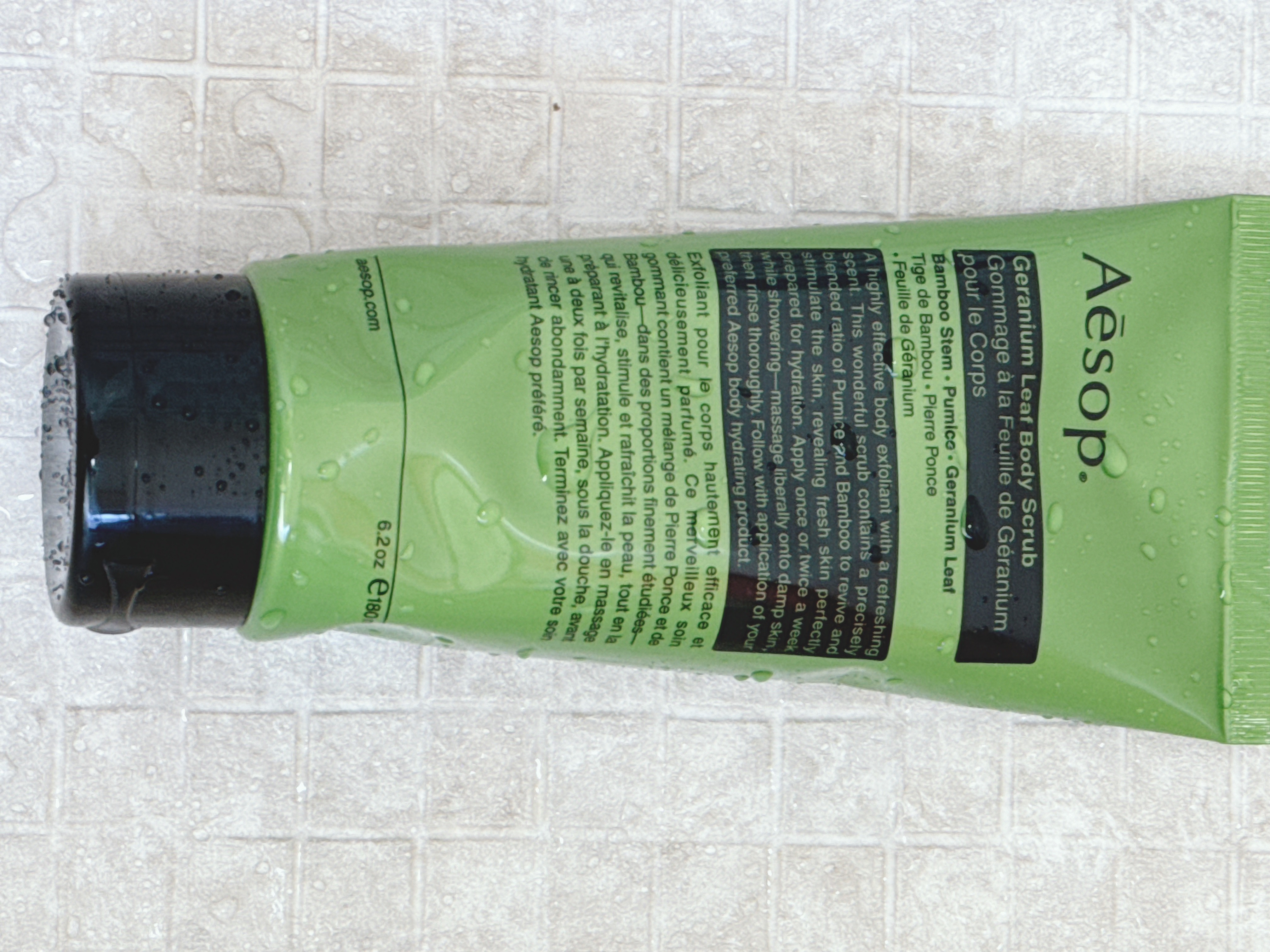 Aesopゼラニウムボディスクラブ180ml。*⑅୨୧୨୧⑅*。これ一本でボディ洗浄とスクラブまで完了する優れものです✨もこもこに泡立つわけじゃないのによく伸びるテスクチャでしっかり洗浄もできてすごいさくらんぼ大2つくらいで全身使えます🍒。*...