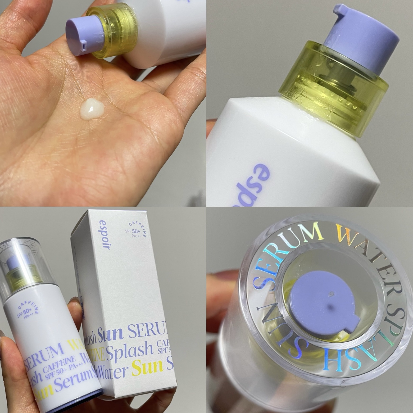 - 忙しい朝にスキンケアと日焼け止めを同時に完了!化粧水、クリーム、日焼け止め、化粧下地まで叶うオールインワン美容液。SPF 50+ / PA +++ カフェイン成分を最適な含量で配合し、朝のむくみをケア。フェイスラインをすっきり整えます。低分子ヒアルロン酸とペプチド配合で、肌を保湿し美容液の効果も。メイクの密着力をアップし、韓国メイクの特徴であるヘルシーなツヤを演出できる化粧下地としても◎ 使用に便利なポンプ式の容器を採用し、さらに時短を実現しました。 <サンクリームCE ミニ付き> +大人気商品エスポアのサンクリームセラミドのミニサイズがセットになって登場! 自然なトーンアップと水分たっぷりの保湿力でナチュラルなツヤを演出します。 【セット内容】 ウォータースプラッシュサンセラム50ml+サンクリームセラミド30ml <サンクリームフレッシュ CICA ミニ付き> +大人気商品エスポアのサンクリームフレッシュCICAのミニサイズがセットになって登場! 自然なトーンアップとさらっとした肌触りが、日焼け止めならではのべたつきをおさえます。CICA成分配合で、肌荒れ中や敏感肌のかたでも安心してご使用いただけます。 【セット内容】 ウォータースプラッシュサンセラム50ml+サンクリームフレッシュCICA30ml