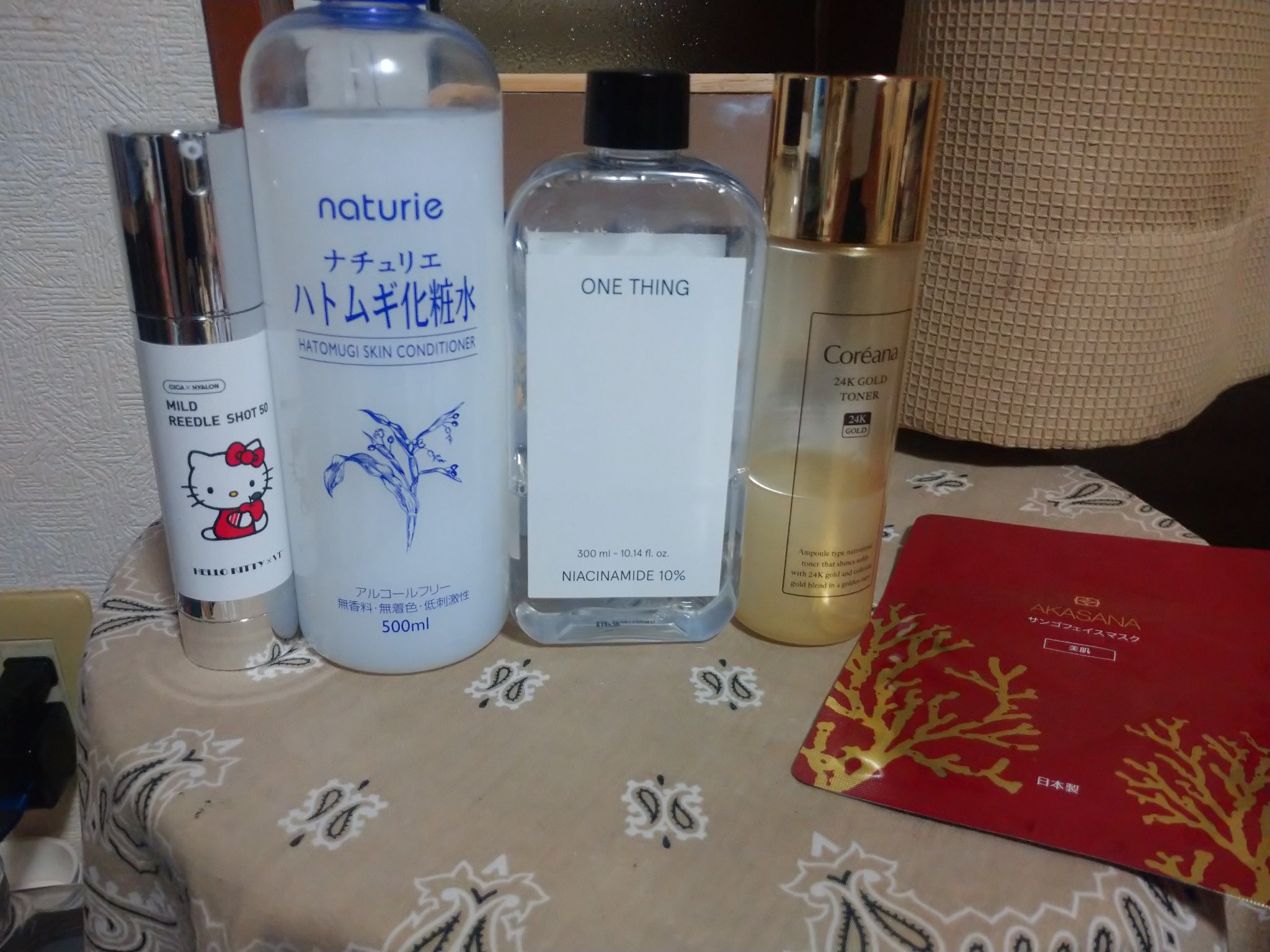水洗顔➭なめらか本舗ミスト化粧水 N➭とろーり化粧水シンプリー➭LIHAWモイスチャーローション(ジャバジャバ化粧水)➭DAISOCICA ローション➭シカモイストオールインワンゲル(軽いマッサージ)➭美白マスク➭肌ラボ白潤プレミアム薬用浸透美白化粧水➭美容液➭肌ラボ白潤プレミアム 薬用浸透美白乳液
