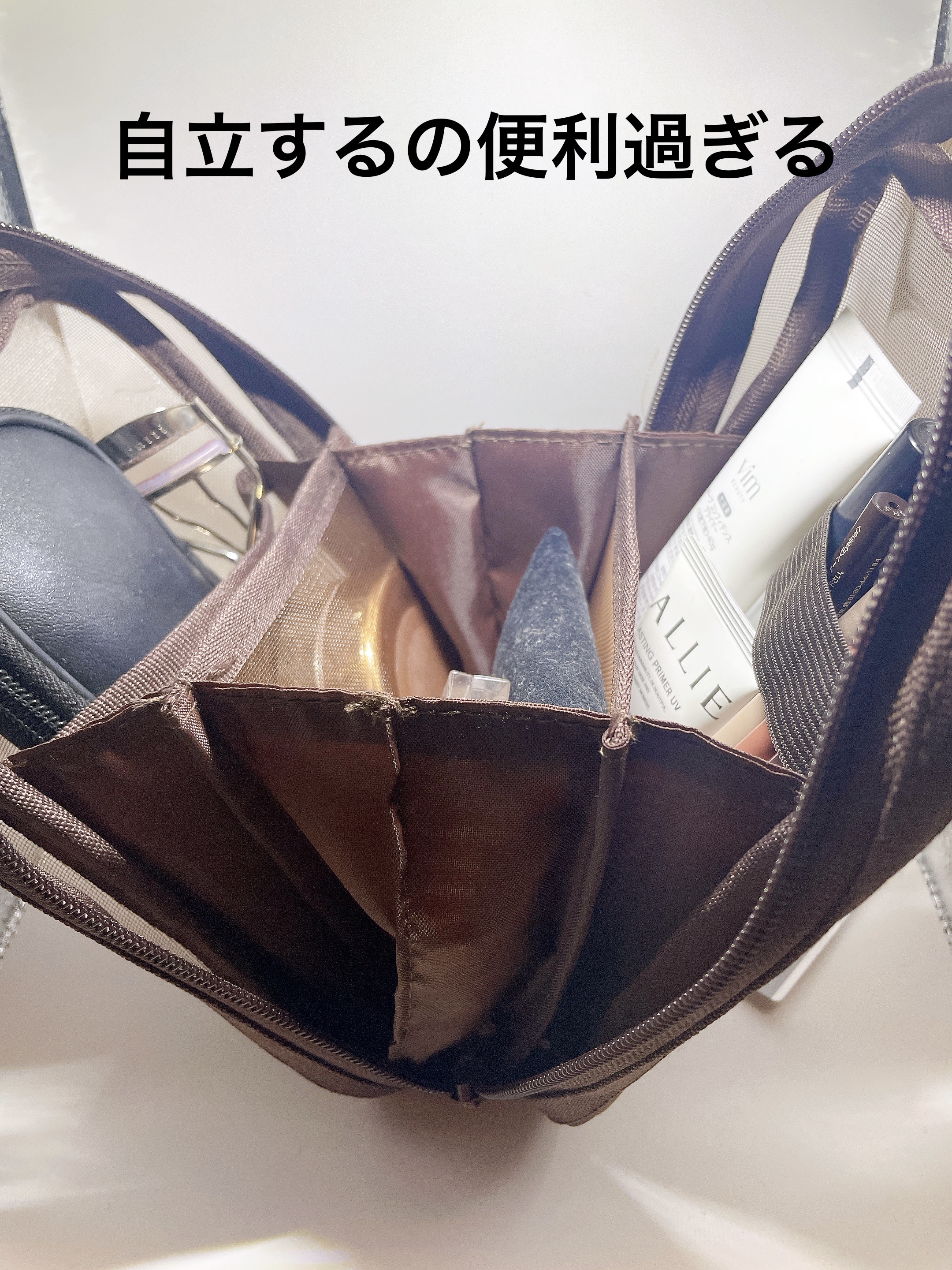 メッシュで通気性もいいし、中央に白鳳堂の筆ぬぐいも、薄型の鏡まで入っちゃう。 これごと持って洗面所で、リビングで、とメイク場所に持って移動しやすいのが最高。 無理なくダブルファスナーで閉めると…ポーチがちゃんと立ってくれちゃう。 この値段なのに優秀すぎる…!