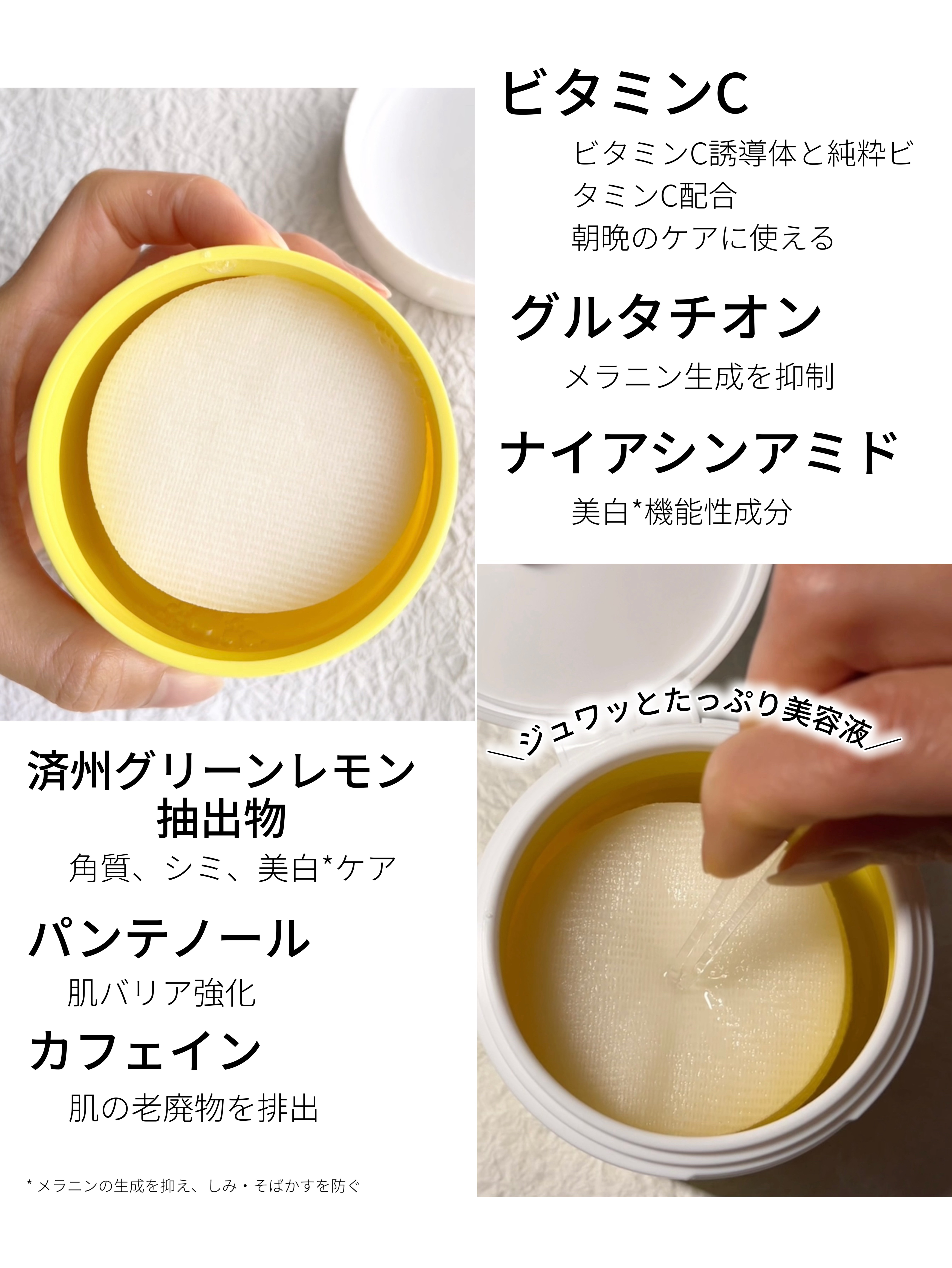 肌に活力を与えるビタミントーニングケア! ビタミンC*、グルタチオン、ナイアシンアミドなど配合。 両面パッドで2重複合機能。 滑らかなガーゼ面は、洗顔後でも残っている肌の老廃物と皮脂を拭き取り。 エッセンスがたっぷり✨ 拭き取りとしても、急いでる時などは簡単パックとしても🙆