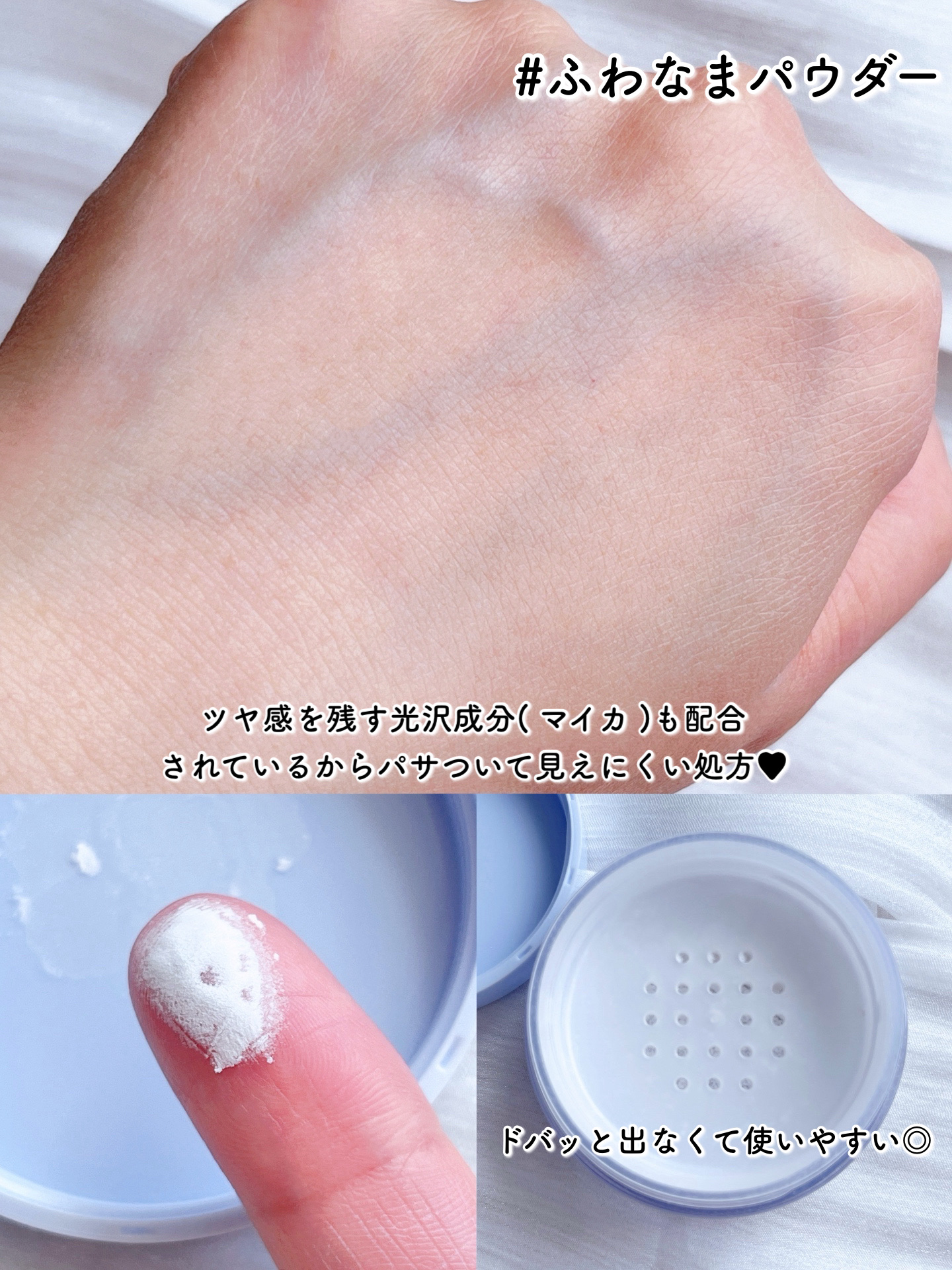 テカリを防ぎ透明感のある肌に ふわなまパウダー待望の定番化🩵 くすみを飛ばすほんのりブルーを入れたクリアパウダーに光沢感がでるマイカを配合✨ 美容液仕立てのしっとり微粒子パウダーでしっかりと毛穴凸凹を補正しメイク崩れも防止!