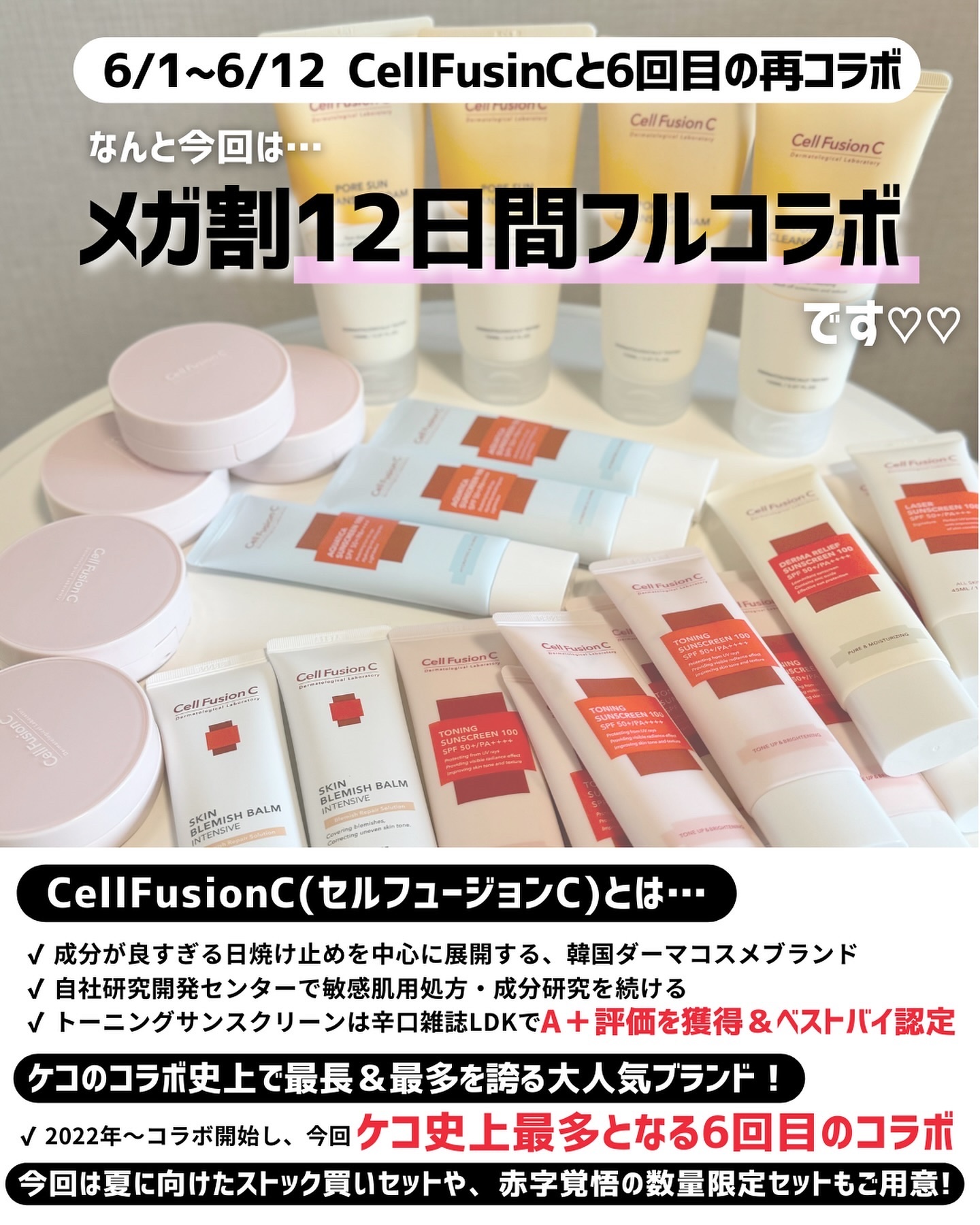 \メガ割にてコラボ開催🥳💜/大人気のCellFusionC‼︎2001年に皮膚科医のノウハウをもとに立ち上げられたブランドです🪄日焼け止めで人気に火がついた🤗✨@cellfusionc_official_jp以前からコラボさせてもらっているグ...