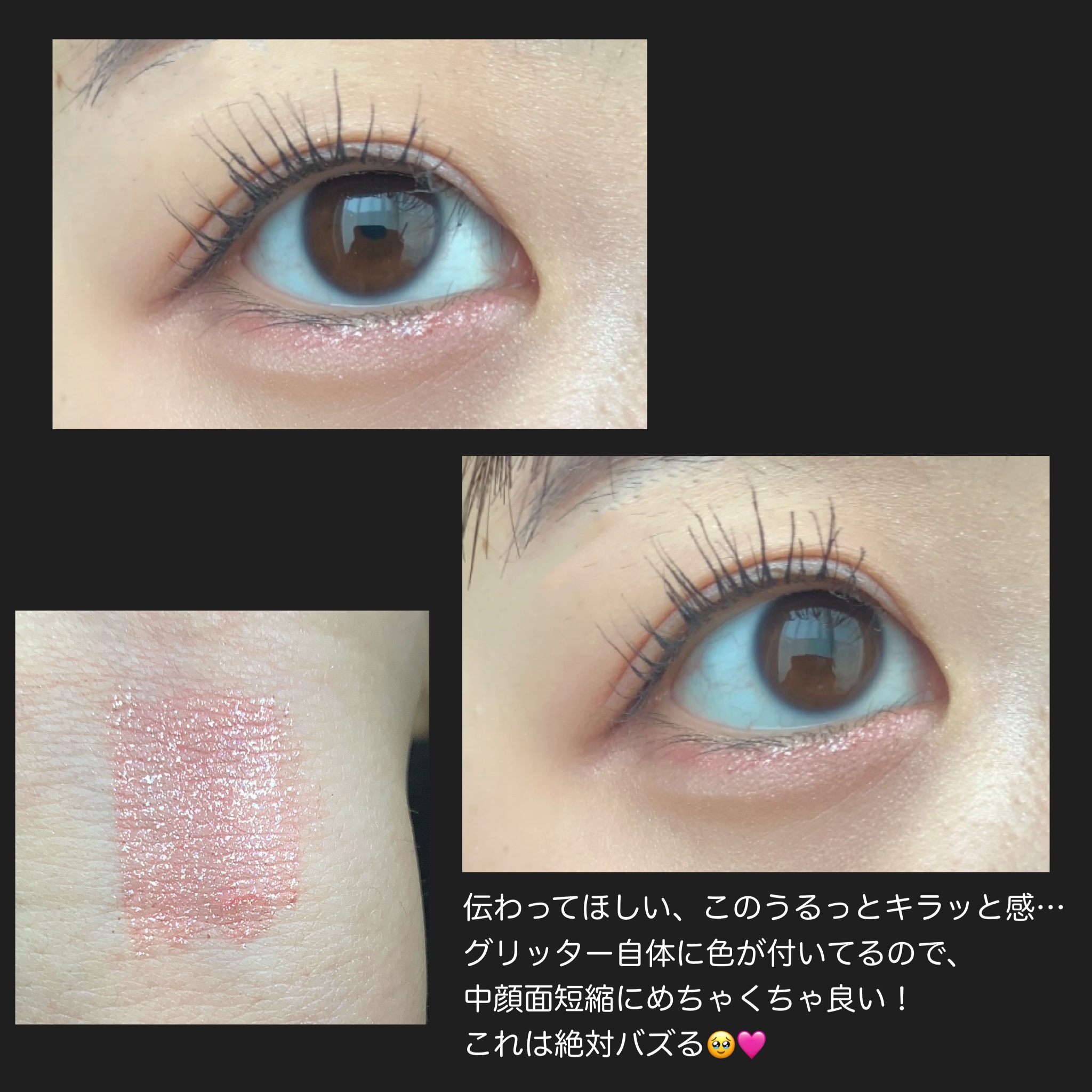 めちゃくちゃうるうるで盛れる!というよりは結構馴染みがいいかんじかな? 色味がピンクというより粘膜の赤って感じなので 色自体が馴染みいいのもあるし、ラメ自体も細かいので なんとなくの赤みとツヤっぽさが足される、と言ったところだろうか… 私自身は涙袋をもっとギラつかせたいタイプの人間なので 正直物足りない😂😂😂 いっそ赤いグリッターとかあったら個性的で可愛いかも(?) ナチュラルなうさぎeyeにしたい方向けかと思います🥹