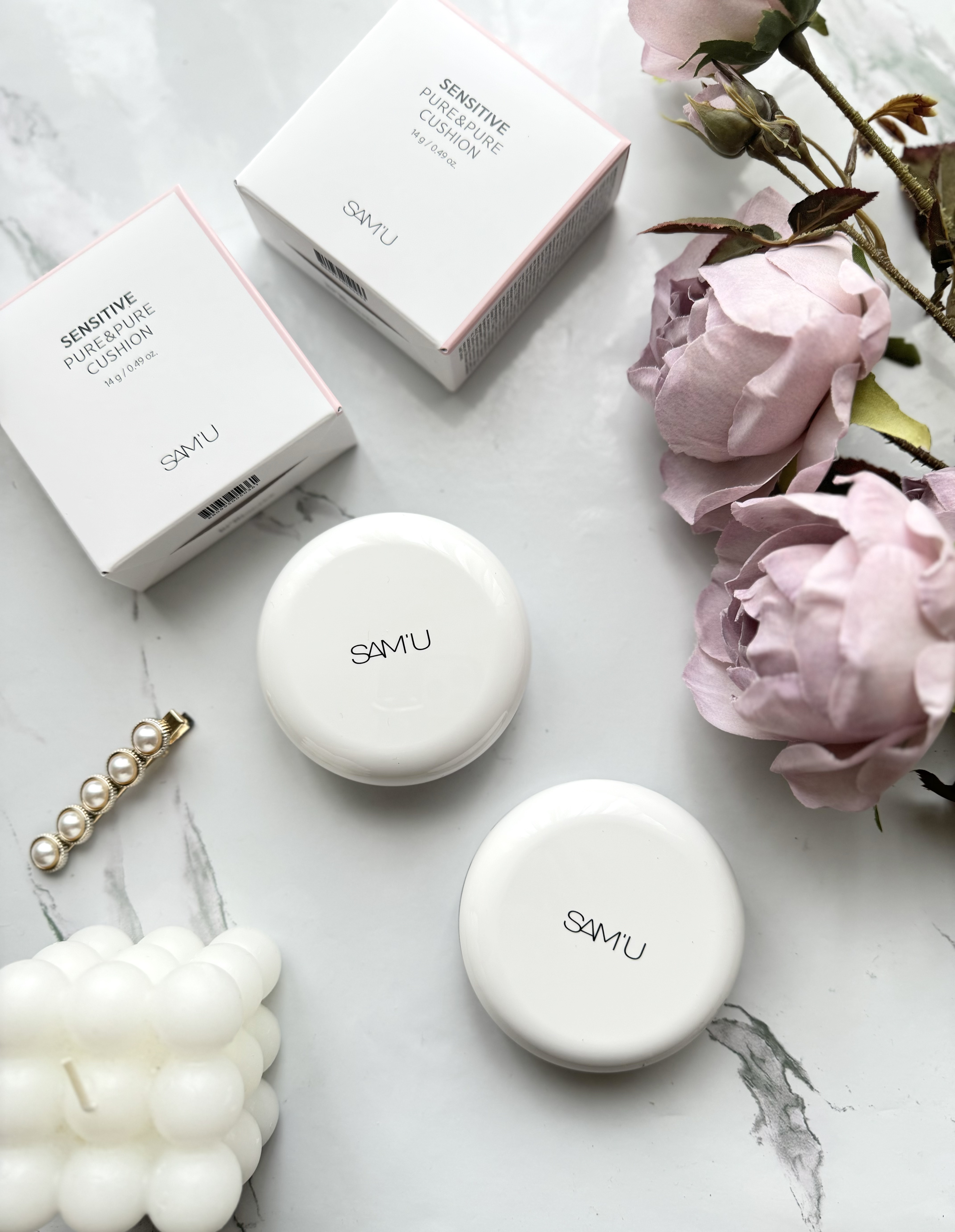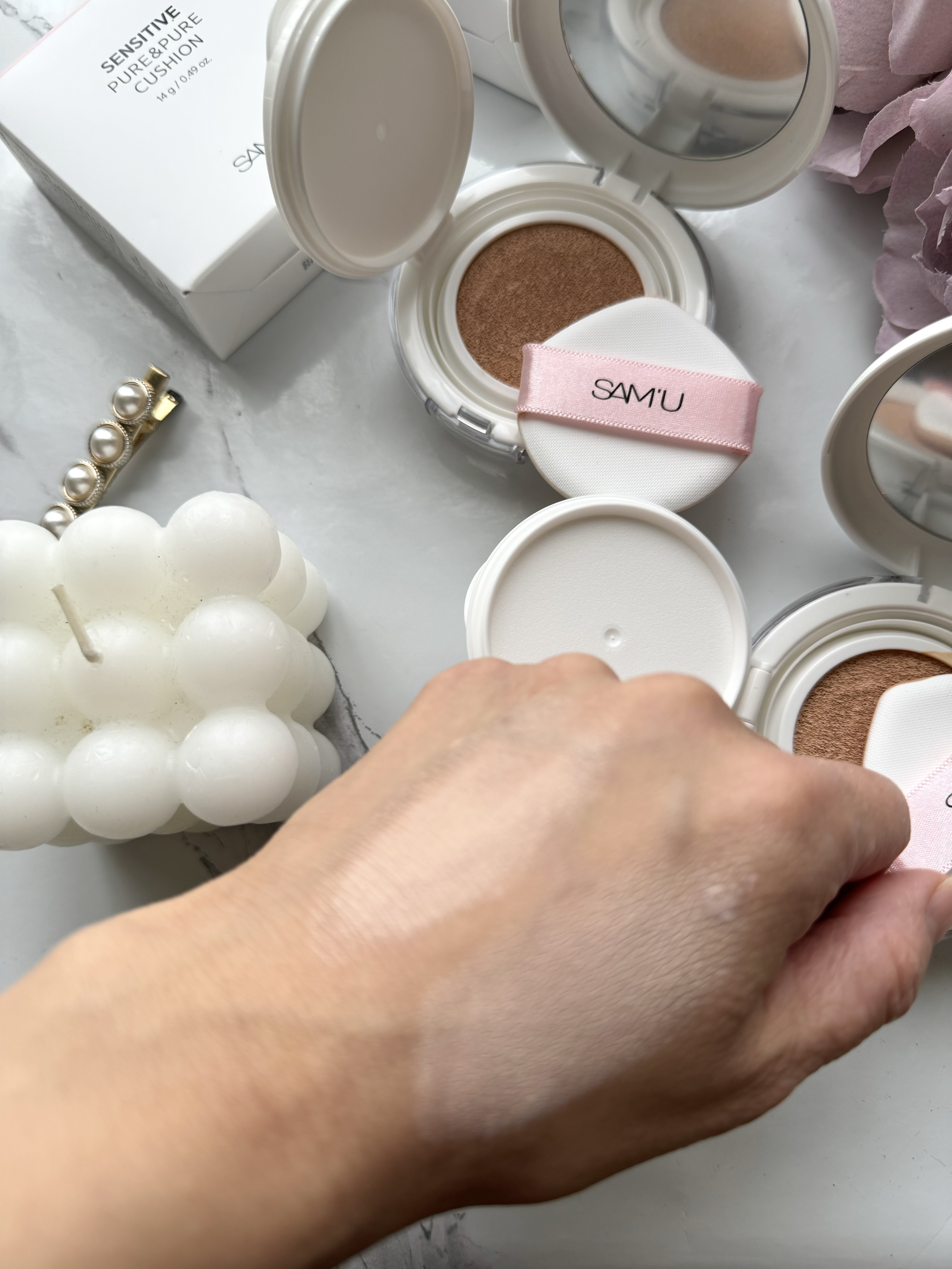 sam's/SENSITIVEPURE&PURECUSHIONサミュから出た新作クッションファンデーション🤍1度のタッチで、まるで素肌のようなツヤ肌へ。エッセンス成分を53%配合し、スキンケアしているような心地よさとカバー力を両立。ガラス玉の...
