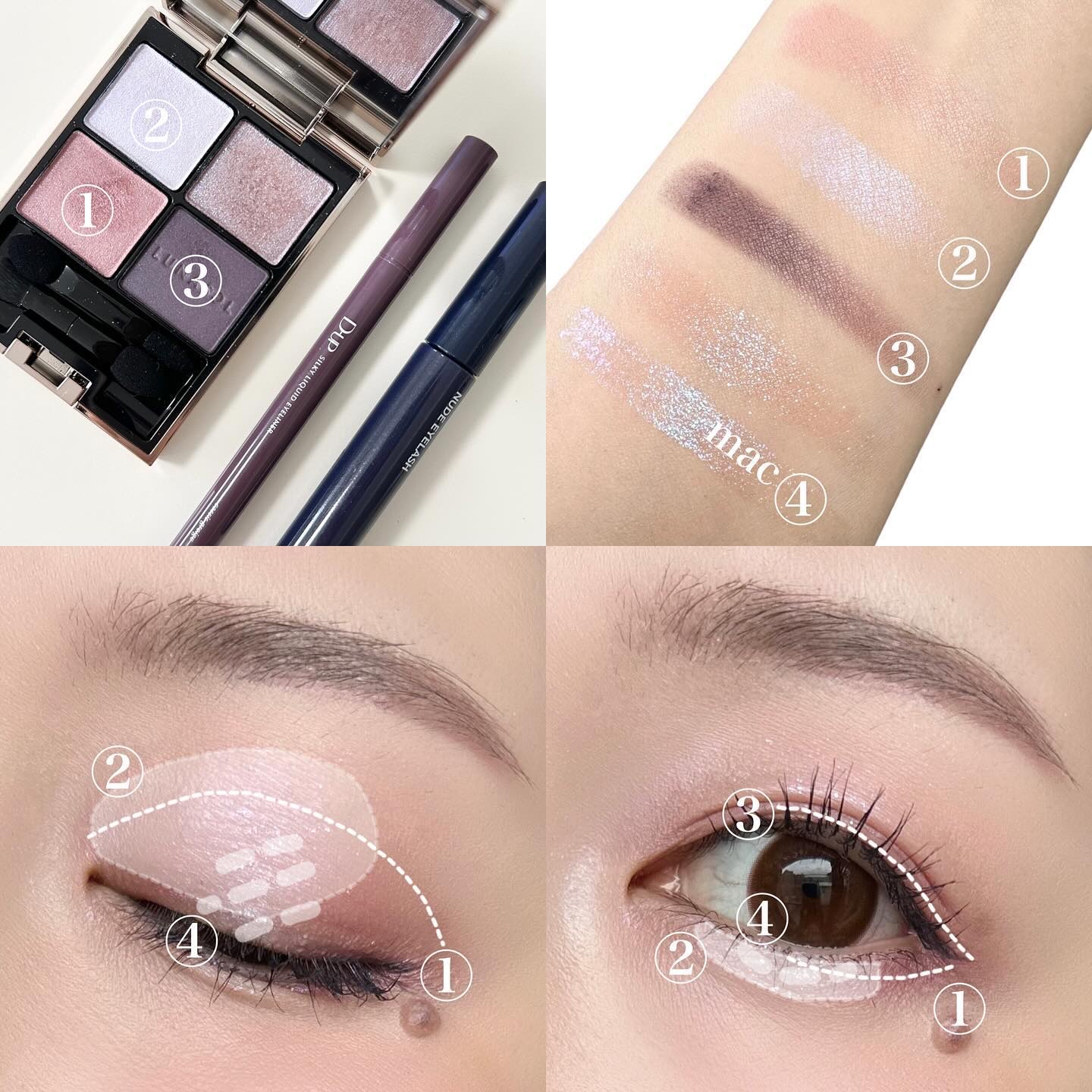 手に試した感じではベースのブルーは弱く、ラメ自体がブルーで可愛すぎる…! BAさんはパウダーアイシャドウのベースにもおすすめと教えてくれたので、 今日はこちらをベースにピンクブラウン系の アイシャドウを使ってメイクしてみたよ🫶🏻 肌に伸ばすとすぐにサラサラになるから ベタベタが残ったりしないし、 パウダーアイシャドウの上に重ねてもヨレない◎