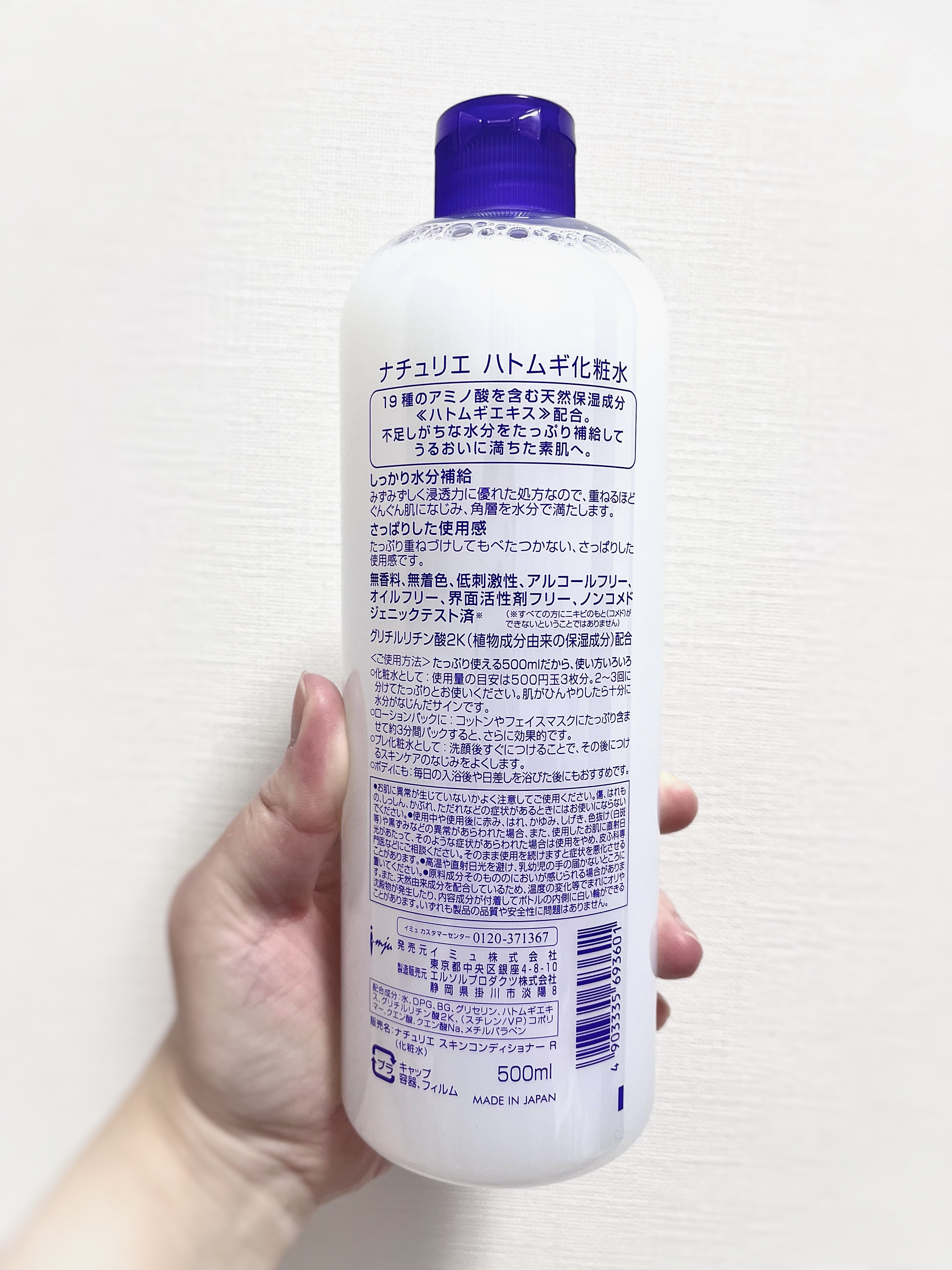 - <通常サイズ 500ml> 水、DPG、BG、グリセリン、ハトムギエキス、グリチルリチン酸2K、(スチレン/VP)コポリマー、クエン酸、クエン酸Na、メチルパラベン <500ml+ 限定ムーミンデザインボトル> 水、DPG、BG、グリセリン、ハトムギエキス、グリチルリチン酸2K、(スチレン/VP)コポリマー、クエン酸、クエン酸Na、メチルパラベン <詰め替えタイプ 480ml> 水、DPG、BG、グリセリン、ハトムギエキス、グリチルリチン酸2K、(スチレン/VP)コポリマー、クエン酸、クエン酸Na、メチルパラベン <旧製品> BG、グリセリン、メチルパラベン、エタノール、グリチルリチン酸2K、ハトムギエキス、DPG、クエン酸Na、プロピルパラベン、クエン酸、(スチレン/アクリレーツ)コポリマー、水 <限定ムーミンデザイン> 水、DPG、BG、グリセリン、ハトムギエキス、グリチルリチン酸2K、(スチレン/VP)コポリマー、クエン酸、クエン酸Na、メチルパラベン