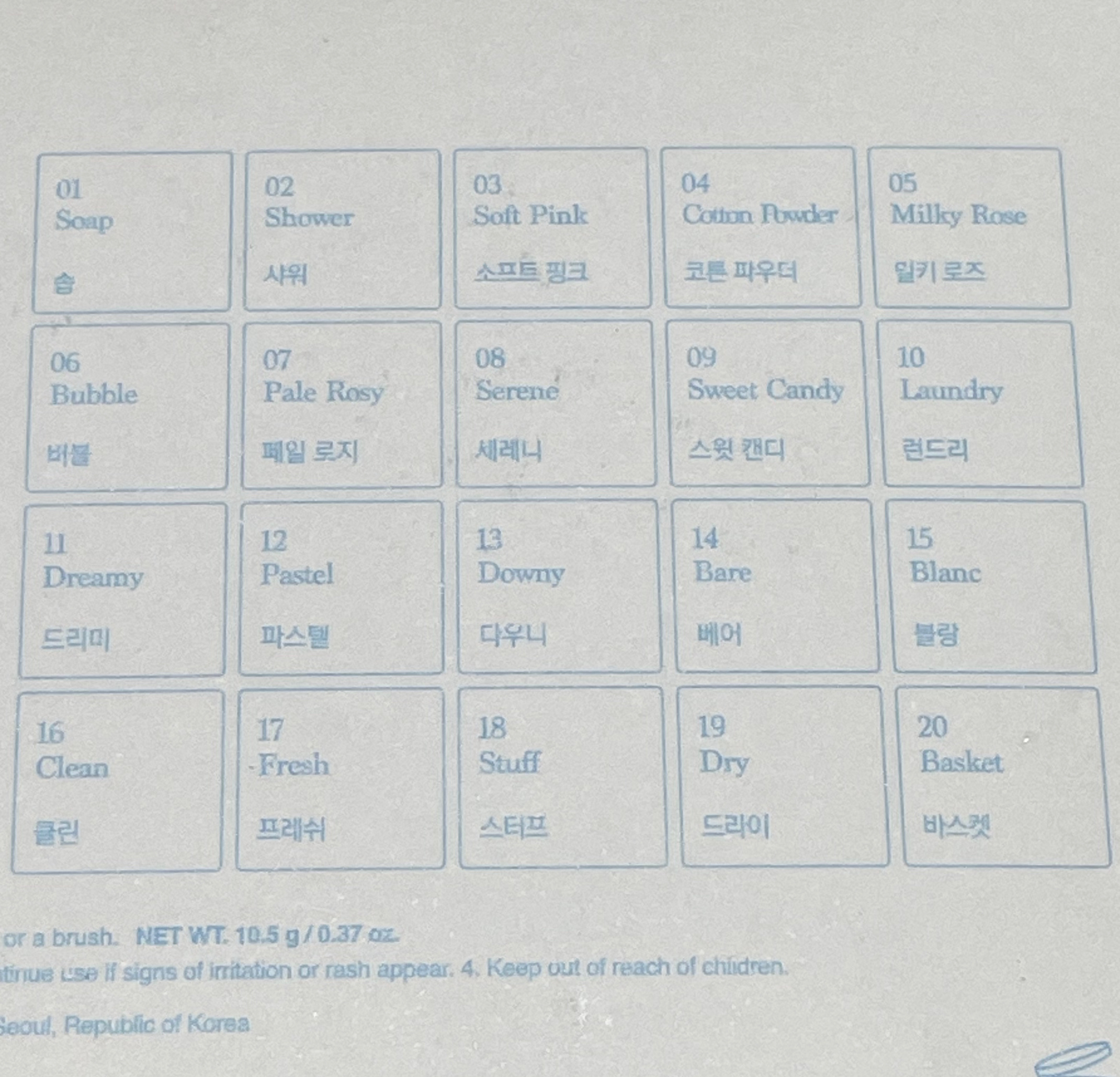 粉質は柔らかく、ふわっと密着します。 10 MUSHROOM マット。グレー系のベージュ。 20 TWO SHOT AMERICANO マット。アイライナー使いにもできるしっかり目のダークブラウン。 22 BEBE パール。涙袋にぴったりのベージュ系カラー。 40 SUPER PINK マット。しっかりと華やかなピンク。 42 CHEW グリッター。ミルクピンクをベースに、ピンクとゴールドラメ入り。 45 BLUSH GREY マット。くすみグレー。 38 PINK ATTENTION 繊細なラメ。偏光パールぽく輝くピンクトーンのハイライト。