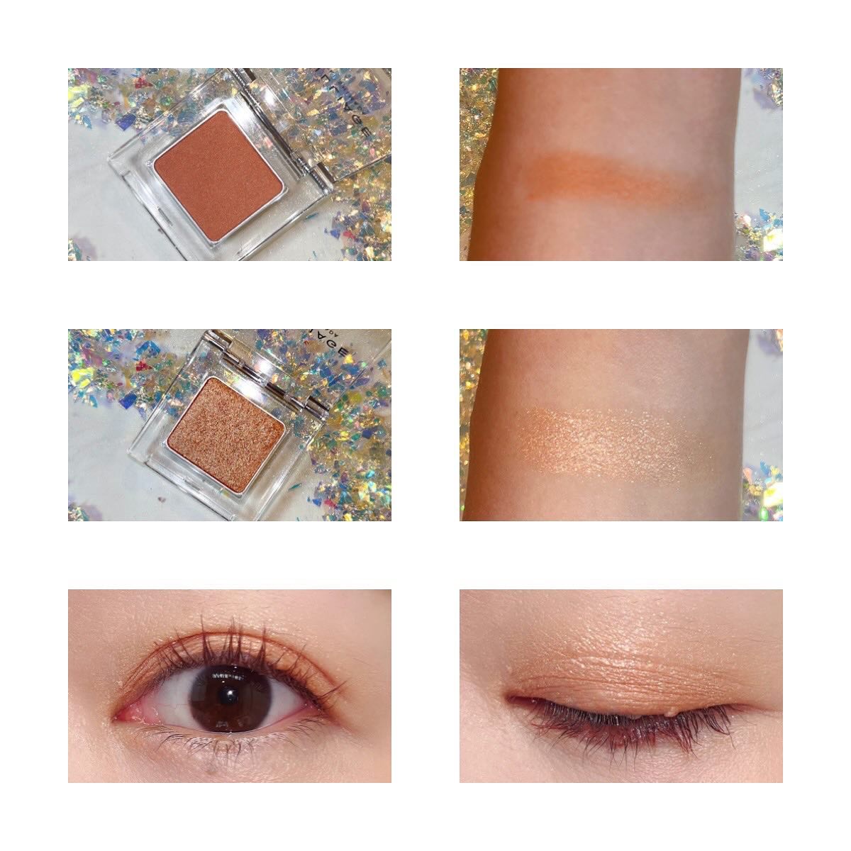 春カラーが好き🌸 春シーズンは欲しいものがたくさんでした。 左下のラメが繊細で綺麗✨ 公式通り、右上&左下をアイホール&下瞼、右下を目の際、左上をアイホールに重ねて。 アプリコット&ピスタチオというオシャレカラーで、繊細なラメ入り。 色持ちはよくて、食事後もしっかり色残りアリ。 縦皺も気にならないし、多分他のカラーも追加購入していくんだろうなぁ…🤣