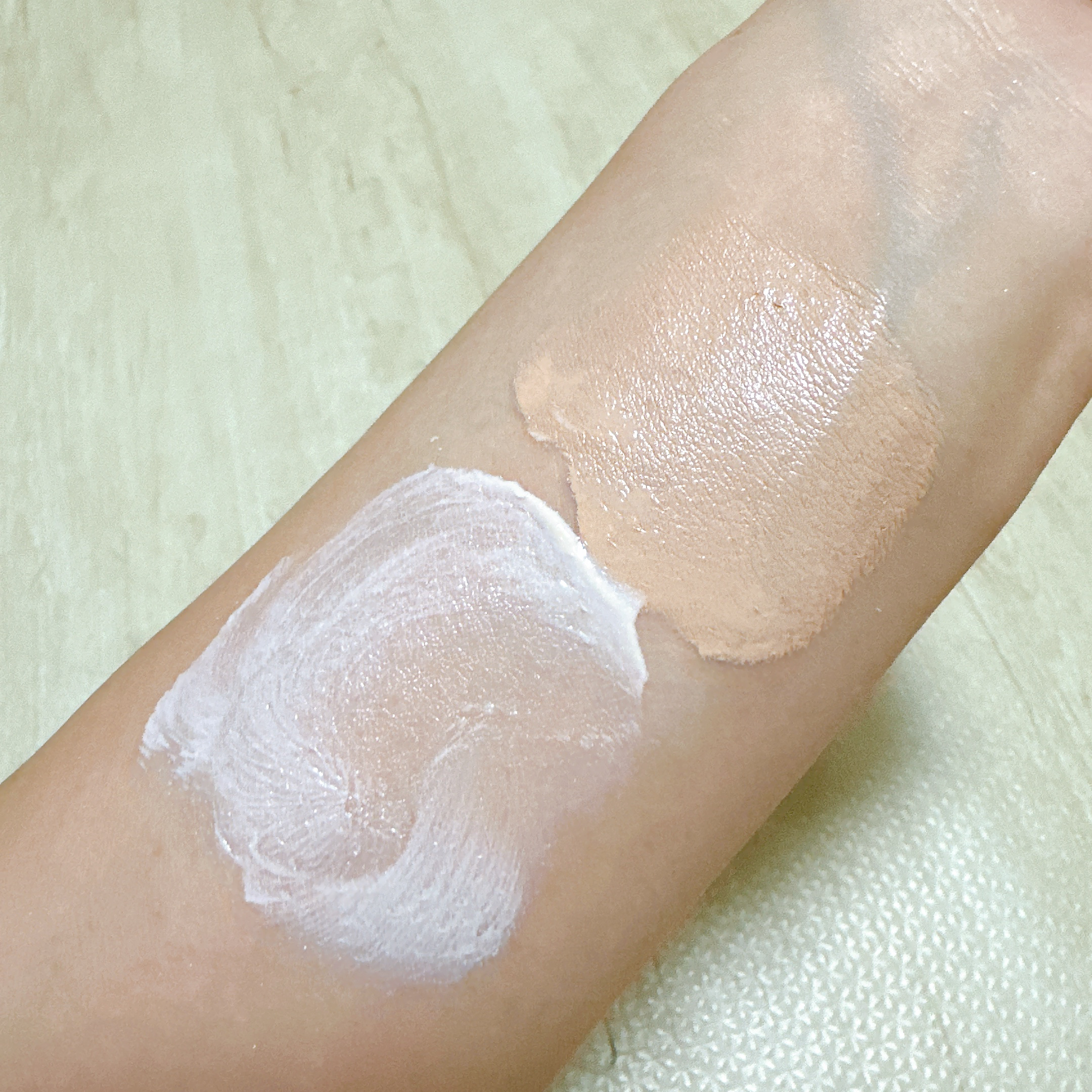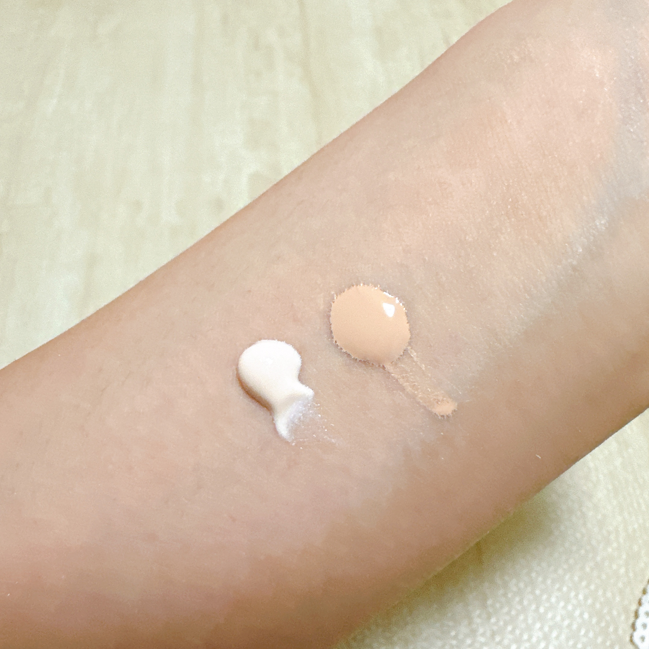 美容液を肌に塗っているような、とてもいい感じ♡ よりみずみずしいテクスチャー。 夕方までぜんぜん乾燥しない! 1日経つと少し乾燥が気になる。 どちらもナチュラルカバー。素肌が綺麗な人!という印象になれる。