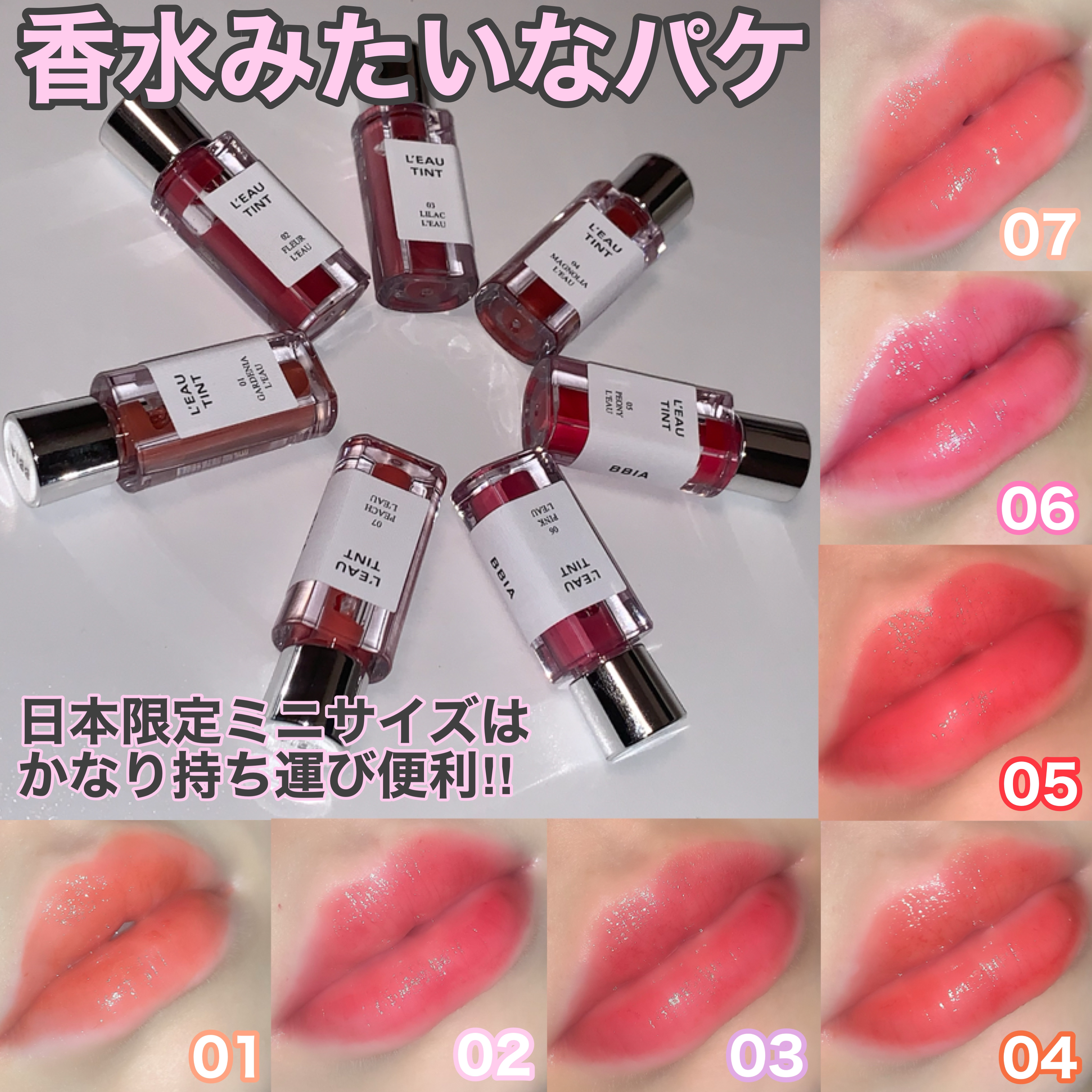- - うるおいリップなのにしっかりカラーが定着し、時間が経っても塗りたてそのままのカラーを維持 *色が落ちにくいことから「飲み会リップ」としてSNSで話題に - 水のように軽くて快適なグロウティント、塗り重ねるほど鮮やかで透明に浮き上がる水彩画カラー - 香水瓶をイメージしたBBIA初のカスタムデザイン。パッケージはもちろん、カラーとテクスチャーに真心を込めて開発
