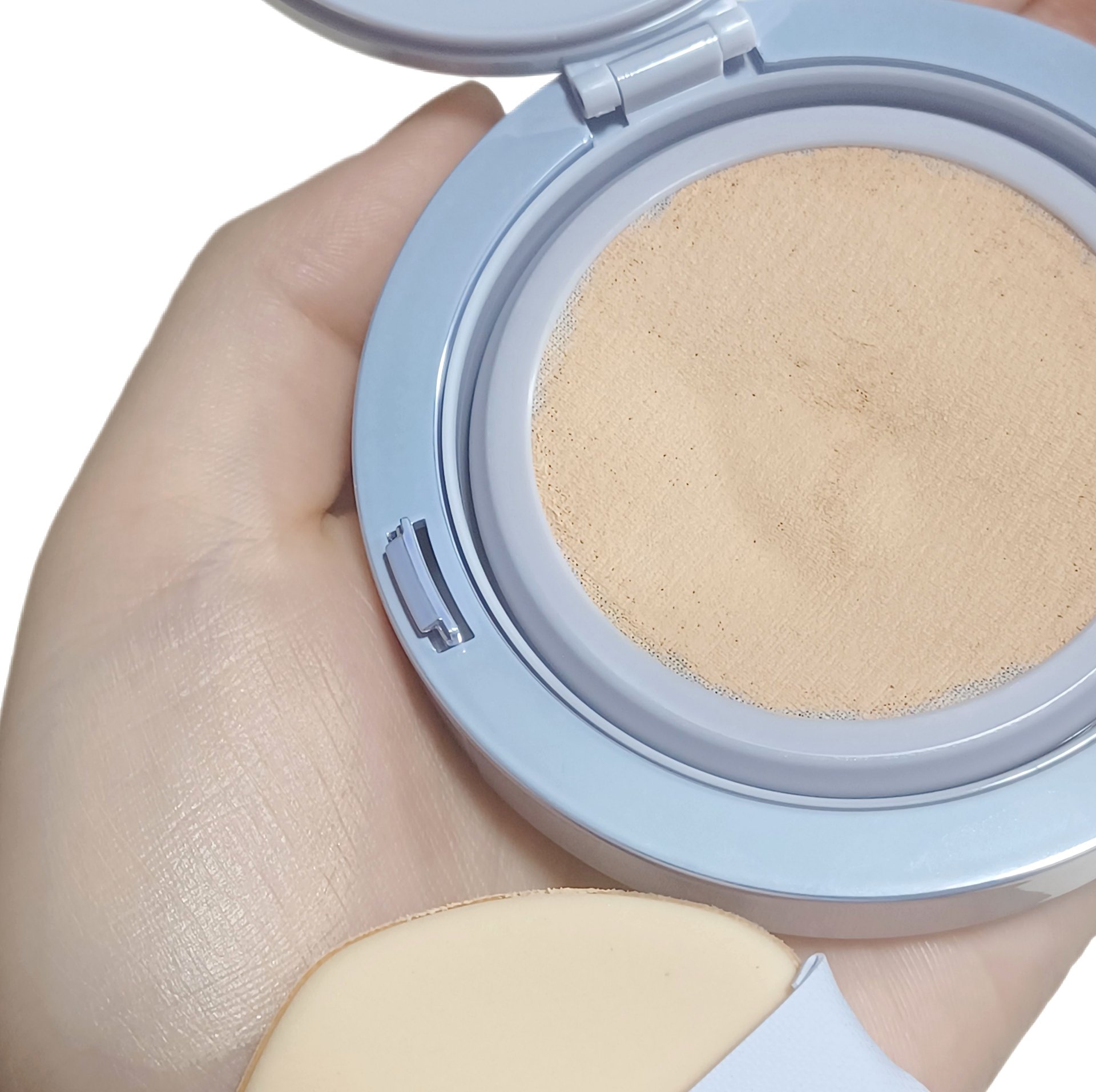 なめらかなテクスチャーで伸びが良く、 柔らかいしずく型のパフは小鼻や目の周りの細かい部分にもムラなく塗ることができ、いつもはカバー力重視で厚塗りになるのが悩みでしたがコンシーラーなしでも毛穴やニキビ跡・色ムラをしっかりとカバーしてくれるのに軽いつけ心地だったのが嬉しいです⭐️ 表面はピタッと密着して、ベタつかないサラサラとした仕上がりになるのでマスクをしても付きにくく内側はしっとりと潤うベルベットな肌に! 今回使用したカラーのアイボリーは肌馴染みがよく、自然にトーンアップもされて普段🇰🇷コスメの21号を使用している自分にピッタリ◎ 夕方になっても毛穴落ち・ヨレ・テカリが気にならず、塗った直後の状態がキープされていたのにも感動しました😊 他のクッションファンデより厚みがないのでポーチにいれて持ち運びにも便利👜で見た目も可愛いので気分が上がる♡♡ これからも使用し続けたいと思います!!