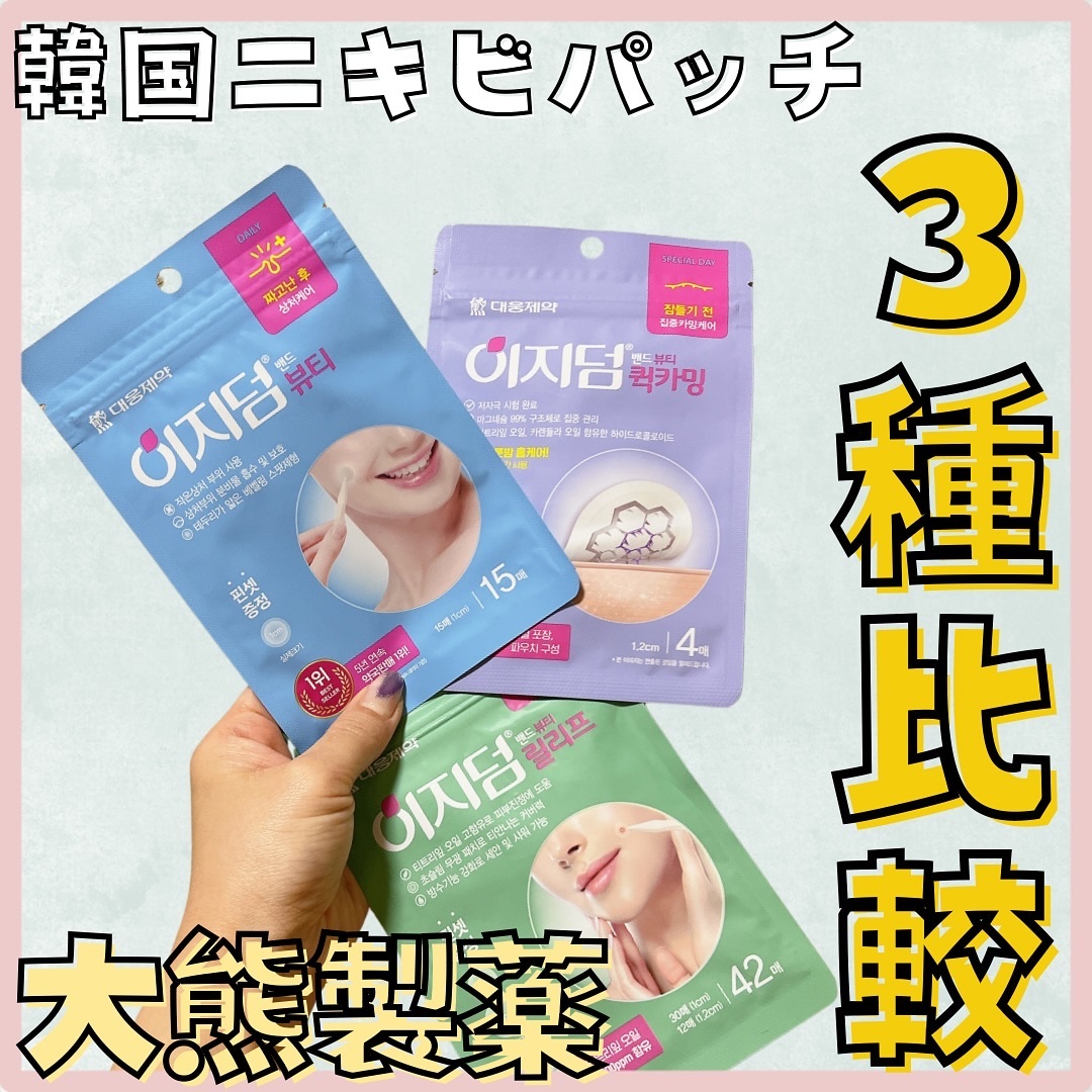 韓国の大手製薬会社『大熊製薬』が開発した話題のニキビパッチ! ニキビの状態に合わせて4種類から選べます。 クイックカーミング(紫)×リアルカーミング(ピンク) 1日で素早くニキビを鎮静させたい時におすすめな組み合わせ! 朝パッチを剥がした時には赤みが引いて ニキビが気にならないくらいまで落ち着いた◎