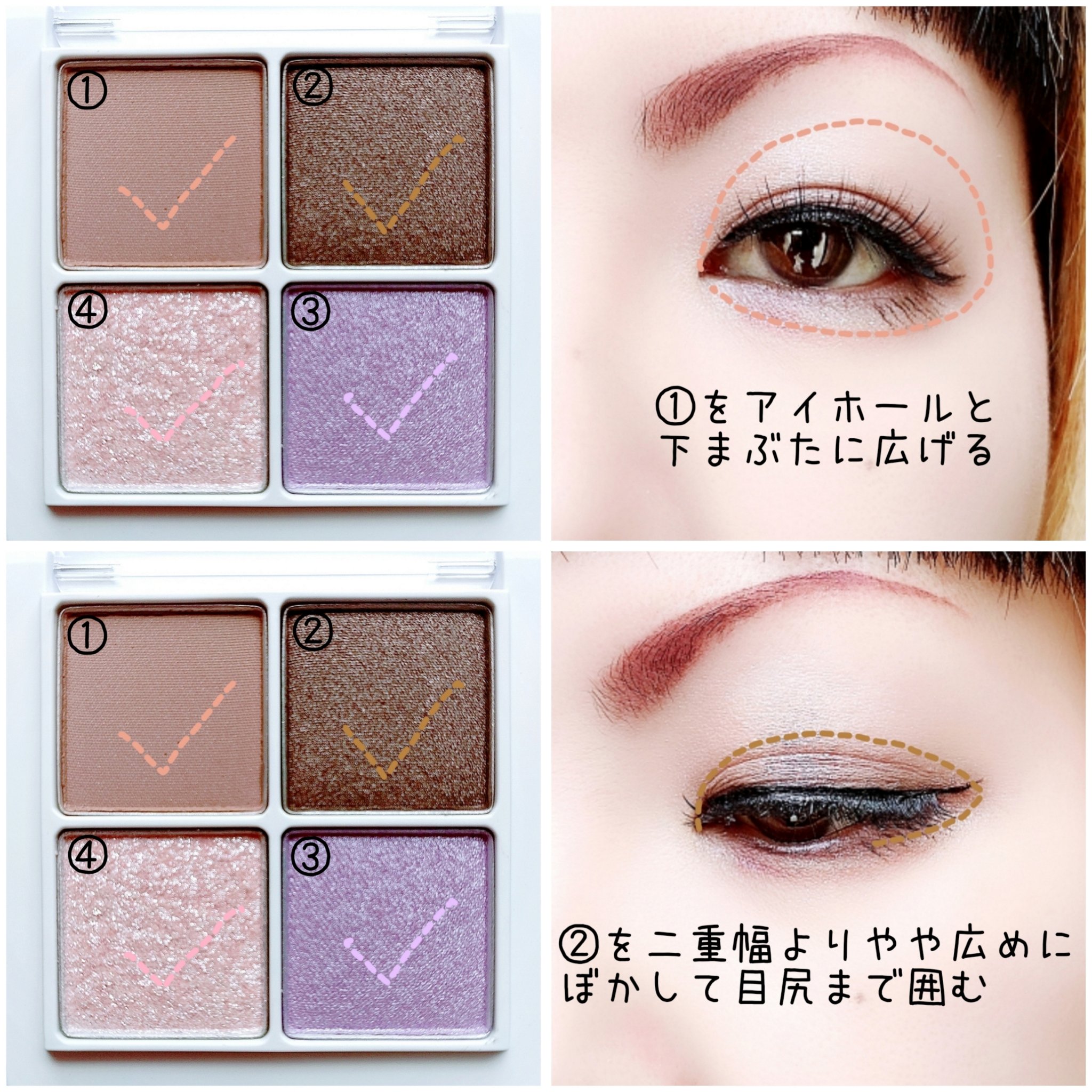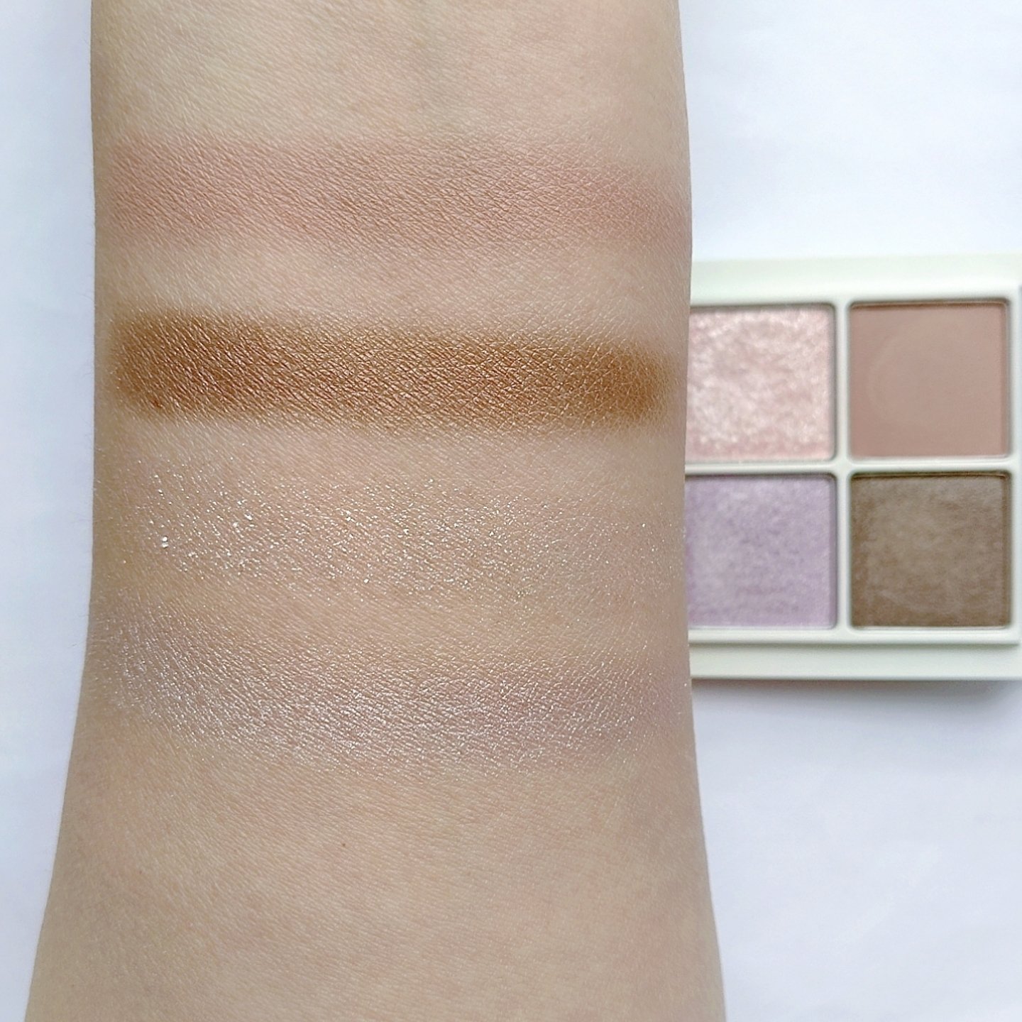 プチプラのクオリティじゃないっ!! 発売前からチェックしていたけれど、ここまで可愛いとは…😆 絶妙カラーで目もとのくすみを飛ばして*明るい印象に🩷 横割りグラデーションでメイクし、立体感をより出したかったので最後に1番左のカラーを上まぶたの真ん中と涙袋にのせています🙆 肌馴染みも良くて粉飛びも感じにくかったです💕 ブラウンの方も店頭に出てたら買おうかな💓