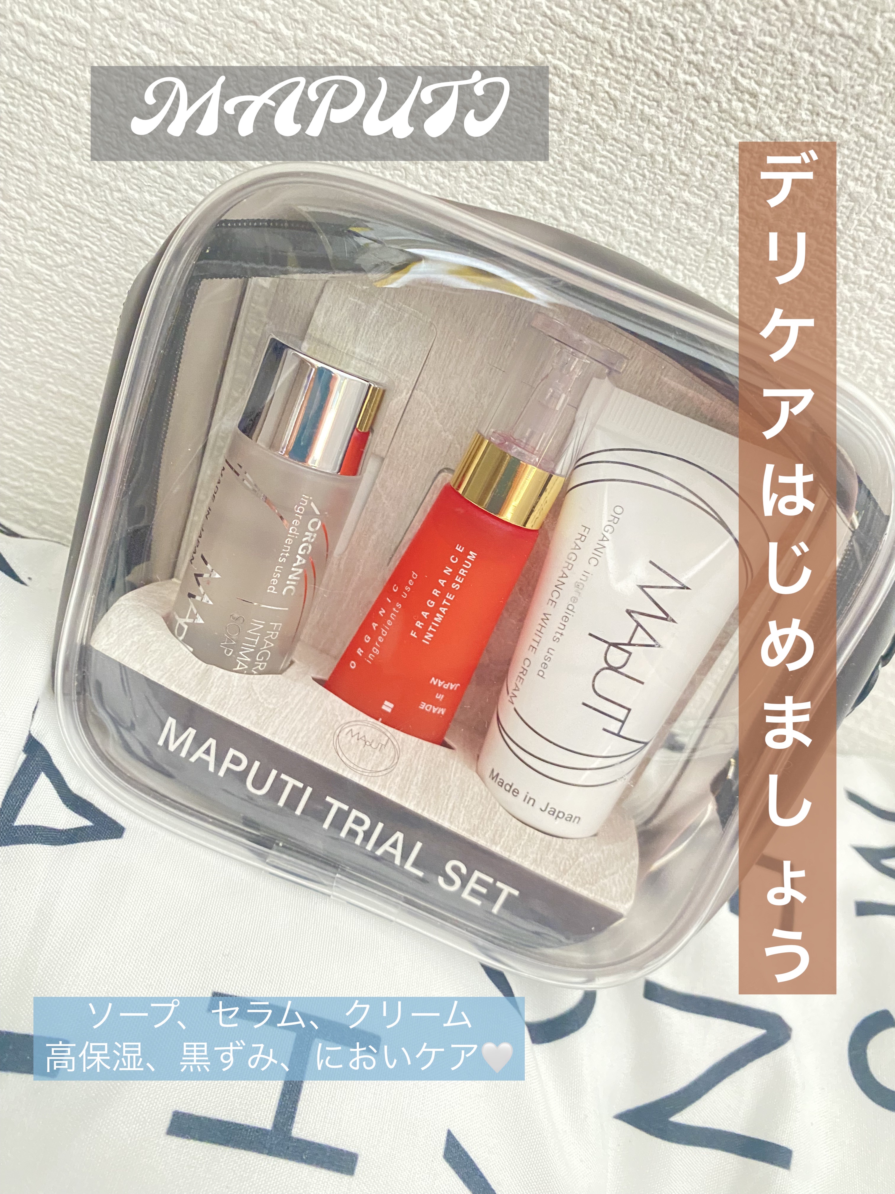 - デリケートゾーンケアと言えば、MAPUTI(マプティ)!ちょっと試してみたいなと思っていた方に朗報です!ソープ、セラム、ホワイトクリーム『7~10日分』がトライアルセットになって1,980円(税込)で登場!旅行やお泊まりにもぴったり。デリケートゾーンのニオイ・黒ずみ*・乾燥対策の完全版を是非お試しになってみて下さい。*古い角質による ソープ:20ml セラム:10ml クリーム:20ml