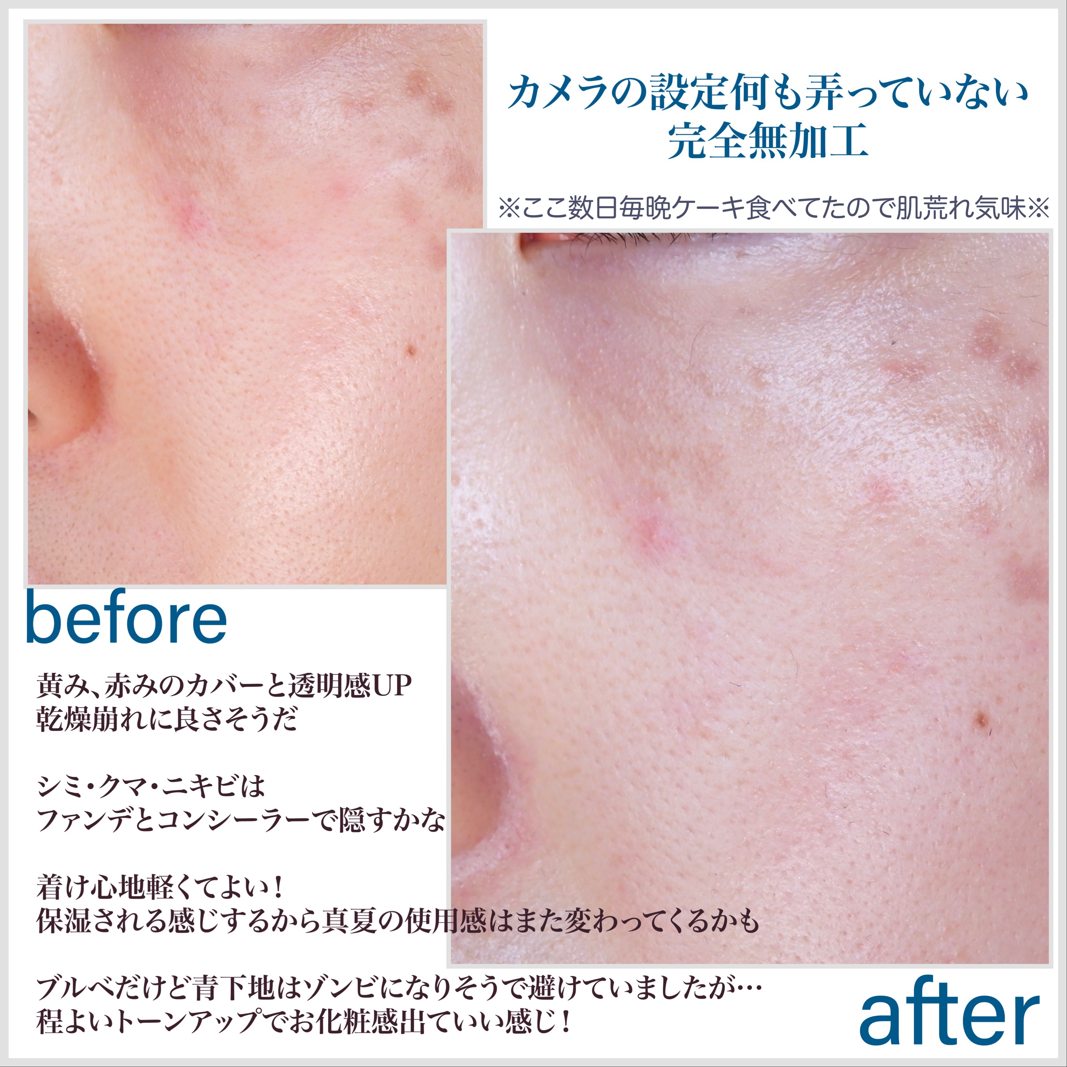 しっとり系日焼け止めトーンアップ下地! 奇跡的にGETできたこちら。 しっかり青みのカラーコントロールするけどカバー力低め(濃い色ムラは透ける)で肌白くなりすぎない。