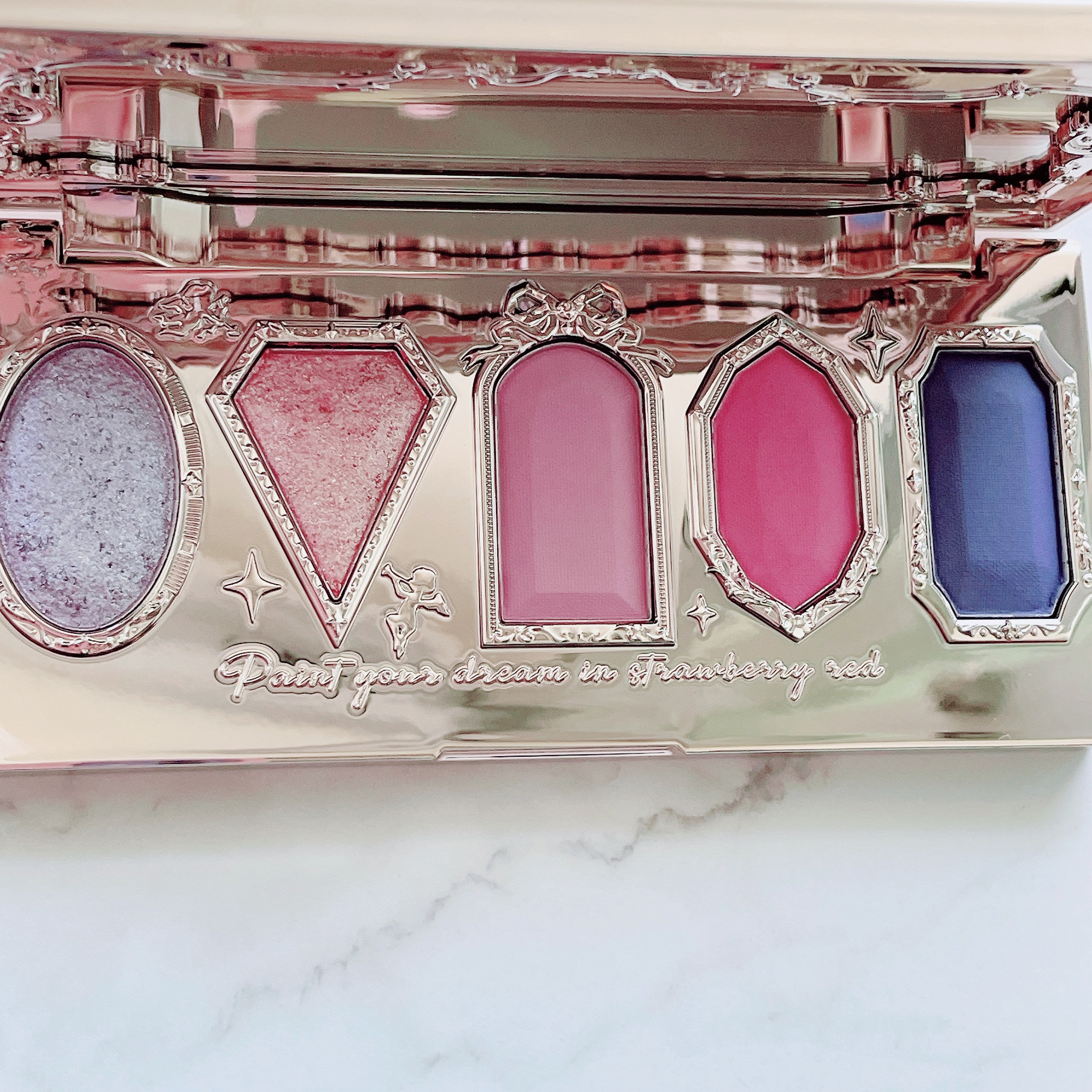 - まるで宝石箱“4+1”マット4色・宝石ラメ1色の粉飛びしにくく心地よいやわらかな感触のパウダーが軽やかにフィットし、洗練された目もとが作れる美しいグラデーションが実現するブラウンメインのアイシャドウパレット。ケースはリボンや七色貝殻に甘い苺スイーツを乗せた宝石箱のデザイン。