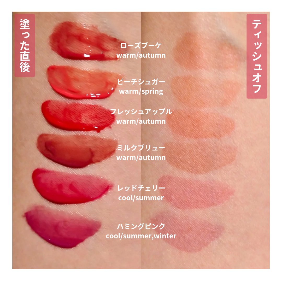 | リップティントランキング第3位 | 重ねて塗っても、ちゅるんと透け感が残って明るめカラーがとっても映える…💕色残りも◎ | 詳細を見る | ||