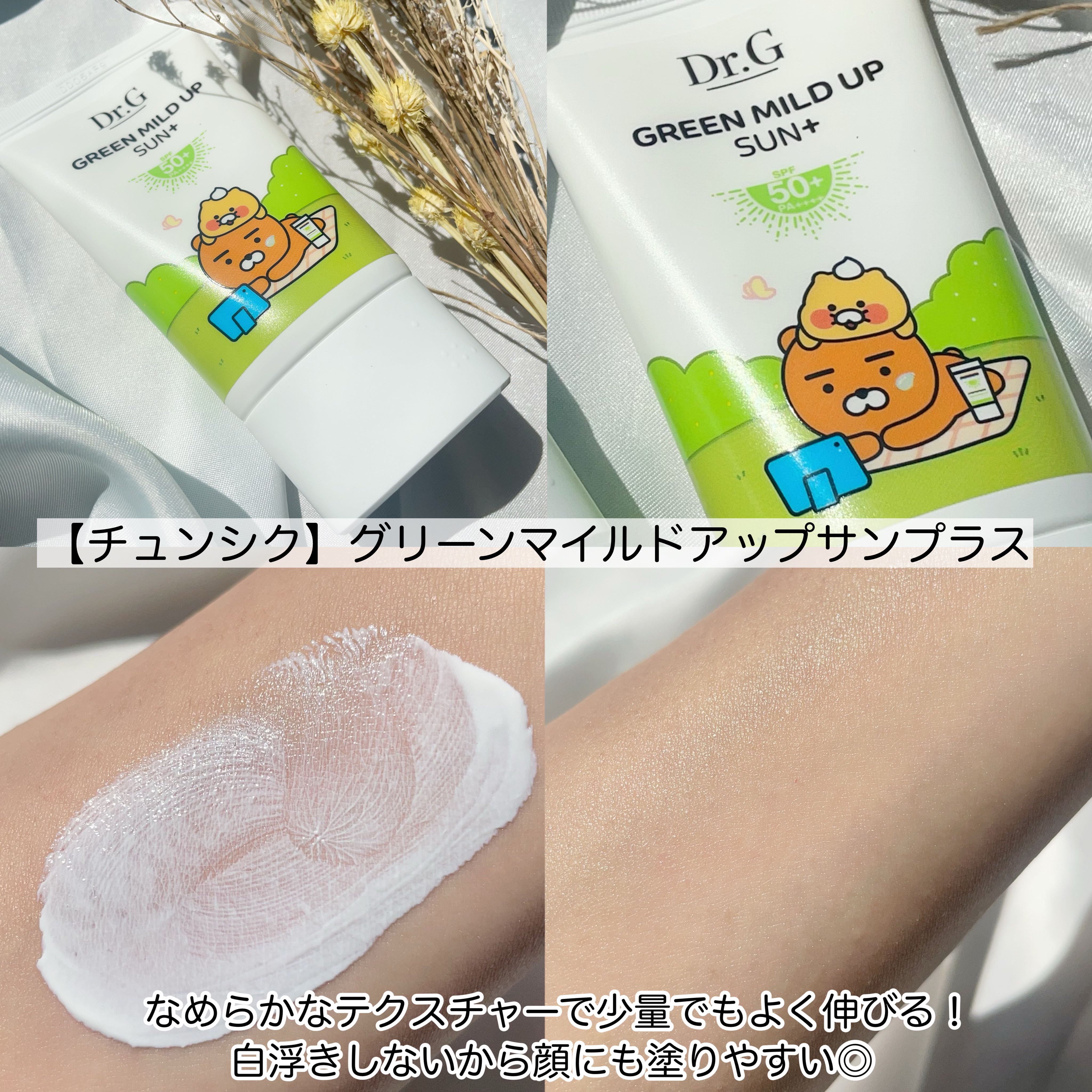 グリーンマイルドアップサンプラスは、ベタつく日焼け止めが苦手な方に特におすすめです。 ブライトニングアップサンプラスは、日焼け止めも化粧下地も一本で済ませたい人に特におすすめしたいです。 どちらの日焼け止めもみずみずしくて伸びのいいテクスチャーです。