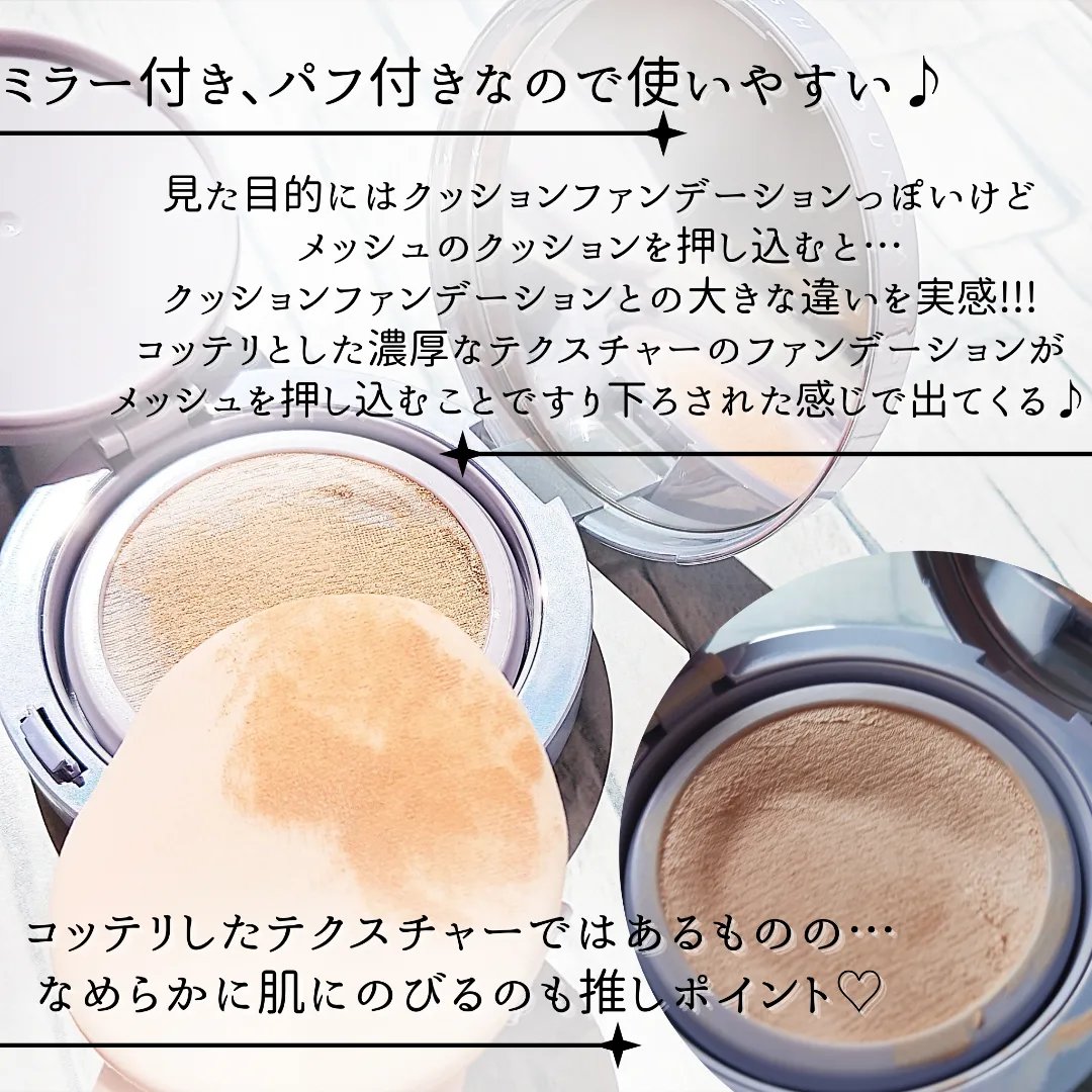 薄づきなのに肌の欠点を完璧カバー♡ カバー力がすごい!赤みや毛穴が目立たないよ☺️ きめ細かくなめらかなテクスチャーで、肌に密着してよれにくい🥺💕 3Dメッシュパフがファンデーションを均一に吸収し肌への密着力を高めてくれるの✨