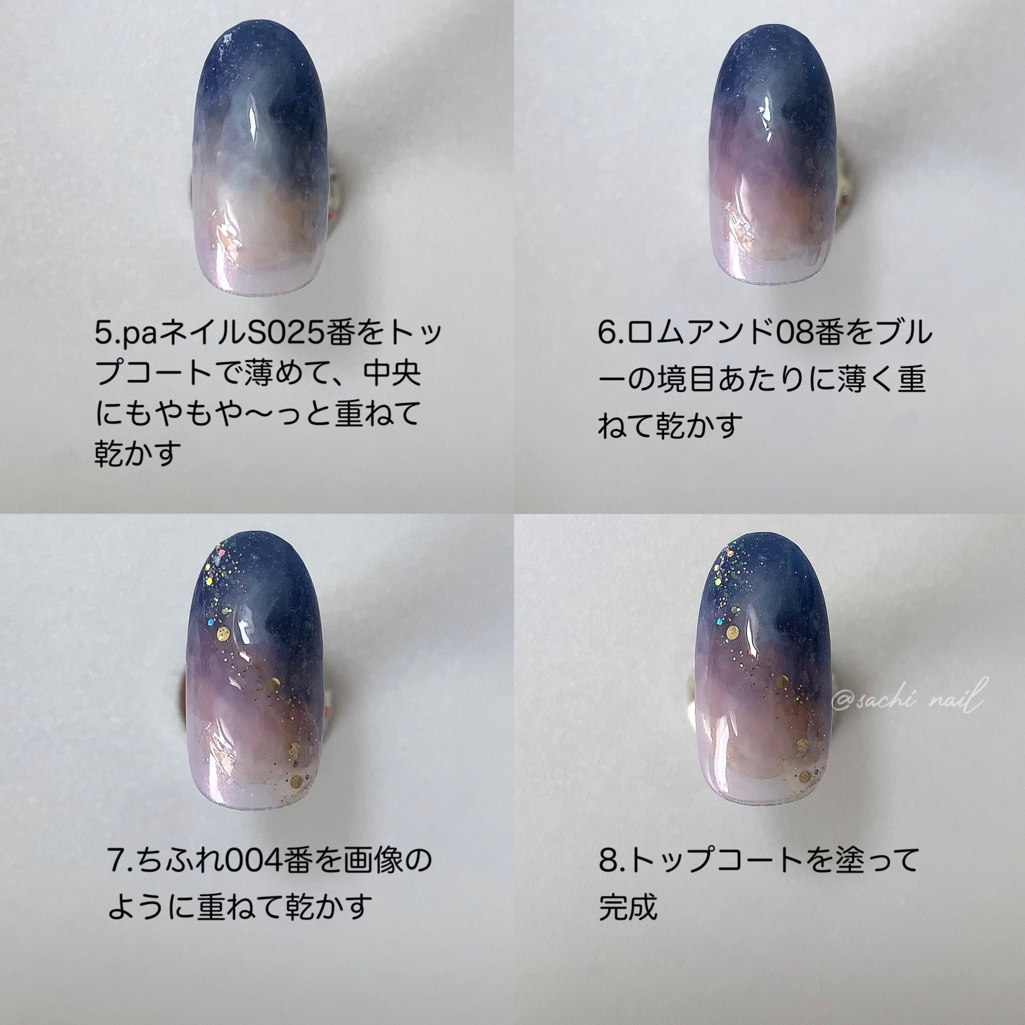 ファンタジーな夜空ネイル🌙【使用ポリッシュ】親指・中指・薬指/ニュアンス塗り◆paネイルカラープレミアムE011親指・中指・薬指・小指/ベースカラー●paネイルカラープレミアAA241親指・小指/爪先ポイント塗り、人差し指ラメグラデ●ちふれネ...