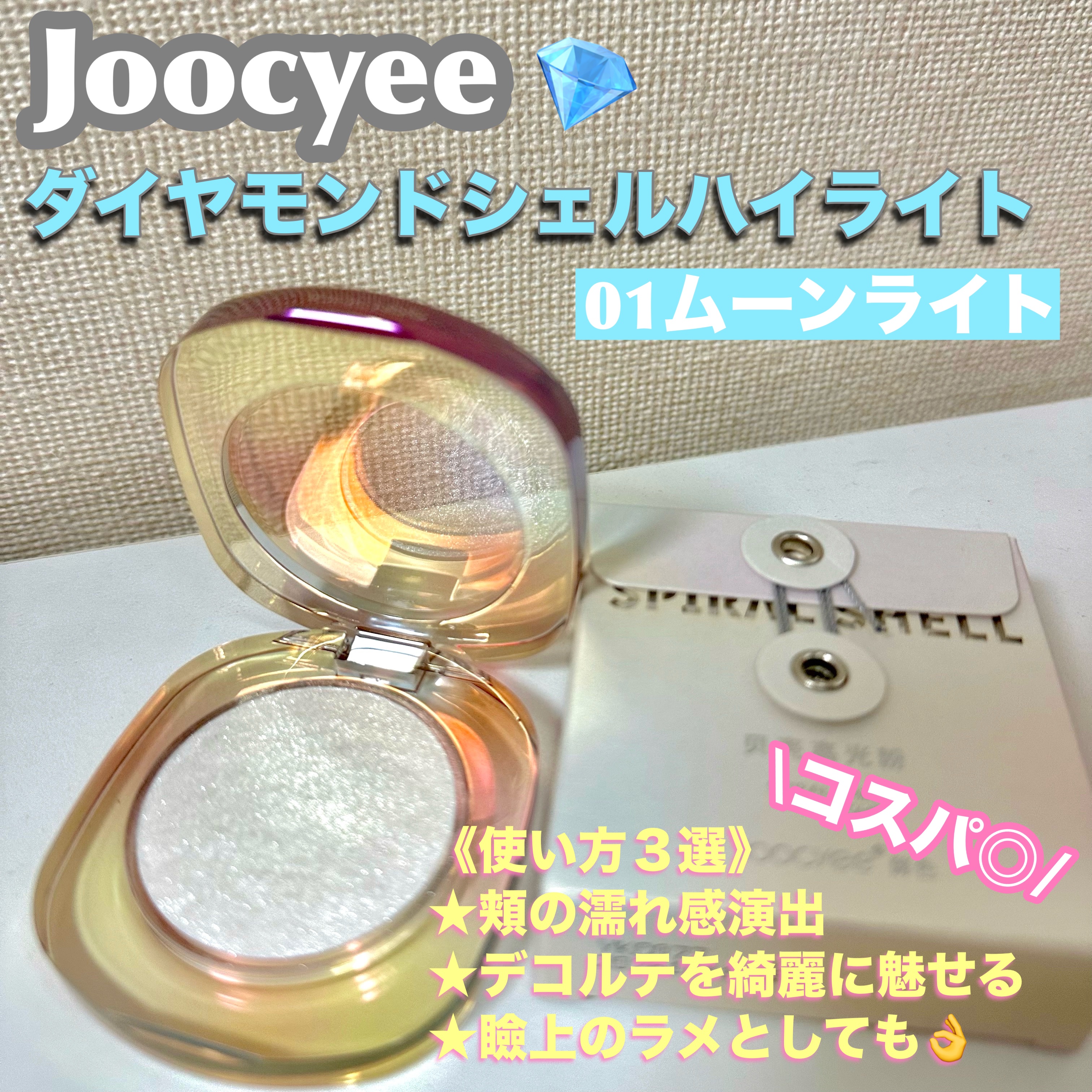 SHEINさまから商品提供でいただきました。JOOCYEEジューシーダイヤモンドシェルハイライト01ムーンライトクラッシュ4.5g2,090円細やかで柔らかい粉質が自然な立体感を作り出すパウダー。オイル配合で肌に馴染みます。独自のジェル処方で...