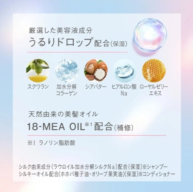 - <シャンプー ポンプ 450ml【旧】> 水、ココイルメチルタウリンNa、ラウロイルメチルアラニンNa、コカミドメチルMEA、ココアンホ酢酸Na、ラウラミドプロピルベタイン、ラウレス-11カルボン酸、ラウレス-23、ラウロイル加水分解シルクNa、ラノリン脂肪酸、加水分解コラーゲン、スクワラン、シア脂油、ヒアルロン酸Na、ローヤルゼリーエキス、ホホバ種子油、クエン酸、ラウロイルサルコシンTEA、乳酸、オレイン酸PEG-6ソルビタン、PPG-2コカミド、トリイソステアリン酸PEG-160ソルビタン、エチルヘキシルグリセリン、PPG-3カプリリルエーテル、ポリクオタニウム-10、ポリクオタニウム-52、DPG、ステアロキシプロピルジメチルアミン、ステアリルアルコール、ラウレス-16、フェノキシエタノール、ベンジルアルコール、エタノール、水酸化Na、安息香酸Na、カラメル、香料 <コンディショナー ポンプ 450ml【旧】> 水、ステアリルアルコール、ジメチコン、DPG、ステアロキシプロピルジメチルアミン、グリセリン、ラノリン脂肪酸、ビスメトキシプロピルアミドイソドコサン、加水分解コラーゲン、スクワラン、シア脂油、ヒアルロン酸Na、ローヤルゼリーエキス、ホホバ種子油、オリーブ果実油、乳酸、リンゴ酸、パルミチン酸イソプロピル、セテアレス-7、セテアレス-25、ポリクオタニウム-39、ポリアクリル酸、ポリアクリル酸Na、アモジメチコン、ビスセテアリルアモジメチコン、ベンジルアルコール、エタノール、香料 <シャンプー ポンプ 450ml 【新】> 水、ココイルメチルタウリンNa、ラウロイルメチルアラニンNa、コカミドメチルMEA、ココアンホ酢酸Na、ラウラミドプロピルベタイン、ラウレス-11カルボン酸、ラウレス-23、ラウロイル加水分解シルクNa、ラノリン脂肪酸、加水分解コラーゲン、スクワラン、シア脂油、ヒアルロン酸Na、ローヤルゼリーエキス、ホホバ種子油、ポリクオタニウム-52、クエン酸、ラウロイルサルコシンTEA、乳酸、オレイン酸PEG-6ソルビタン、PPG-2コカミド、トリイソステアリン酸PEG-160ソルビタン、エチルヘキシルグリセリン、PPG-3カプリリルエーテル、ポリクオタニウム-10、DPG、ステアロキシプロピルジメチルアミン、ステアリルアルコール、ラウレス-16、フェノキシエタノール、ベンジルアルコール、エタノール、水酸化Na、安息香酸Na、EDTA-2Na、カラメル、香料 <コンディショナー ポンプ 450ml【新】> 水、ステアリルアルコール、ジメチコン、DPG、ステアロキシプロピルジメチルアミン、グリセリン、ラノリン脂肪酸、ビスメトキシプロピルアミドイソドコサン、加水分解コラーゲン、スクワラン、シア脂油、ヒアルロン酸Na、ローヤルゼリーエキス、ホホバ種子油、オリーブ果実油、乳酸、リンゴ酸、パルミチン酸イソプロピル、セテアレス-7、セテアレス-25、ポリクオタニウム-39、ポリアクリル酸、ポリアクリル酸Na、アモジメチコン、ビスセテアリルアモジメチコン、ベンジルアルコール、エタノール、香料 <シャンプー つめかえ用 340ml【新】> 水、ココイルメチルタウリンNa、ラウロイルメチルアラニンNa、コカミドメチルMEA、ココアンホ酢酸Na、ラウラミドプロピルベタイン、ラウレス-11カルボン酸、ラウレス-23、ラウロイル加水分解シルクNa、ラノリン脂肪酸、加水分解コラーゲン、スクワラン、シア脂油、ヒアルロン酸Na、ローヤルゼリーエキス、ホホバ種子油、ポリクオタニウム-52、クエン酸、ラウロイルサルコシンTEA、乳酸、オレイン酸PEG-6ソルビタン、PPG-2コカミド、トリイソステアリン酸PEG-160ソルビタン、エチルヘキシルグリセリン、PPG-3カプリリルエーテル、ポリクオタニウム-10、DPG、ステアロキシプロピルジメチルアミン、ステアリルアルコール、ラウレス-16、フェノキシエタノール、ベンジルアルコール、エタノール、水酸化Na、安息香酸Na、EDTA-2Na、カラメル、香料 <コンディショナー つめかえ用 340ml【新】> 水、ステアリルアルコール、ジメチコン、DPG、ステアロキシプロピルジメチルアミン、グリセリン、ラノリン脂肪酸、ビスメトキシプロピルアミドイソドコサン、加水分解コラーゲン、スクワラン、シア脂油、ヒアルロン酸Na、ローヤルゼリーエキス、ホホバ種子油、オリーブ果実油、乳酸、リンゴ酸、パルミチン酸イソプロピル、セテアレス-7、セテアレス-25、ポリクオタニウム-39、ポリアクリル酸、ポリアクリル酸Na、アモジメチコン、ビスセテアリルアモジメチコン、ベンジルアルコール、エタノール、香料 <ペアセット> 水、ココイルメチルタウリンNa、ラウロイルメチルアラニンNa、コカミドメチルMEA、ココアンホ酢酸Na、ラウラミドプロピルベタイン、ラウレス-11カルボン酸、ラウレス-23、ラウロイル加水分解シルクNa、ラノリン脂肪酸、加水分解コラーゲン、スクワラン、シア脂油、ヒアルロン酸Na、ローヤルゼリーエキス、ホホバ種子油、クエン酸、ラウロイルサルコシンTEA、乳酸、オレイン酸PEG-6ソルビタン、PPG-2コカミド、トリイソステアリン酸PEG-160ソルビタン、エチルヘ
