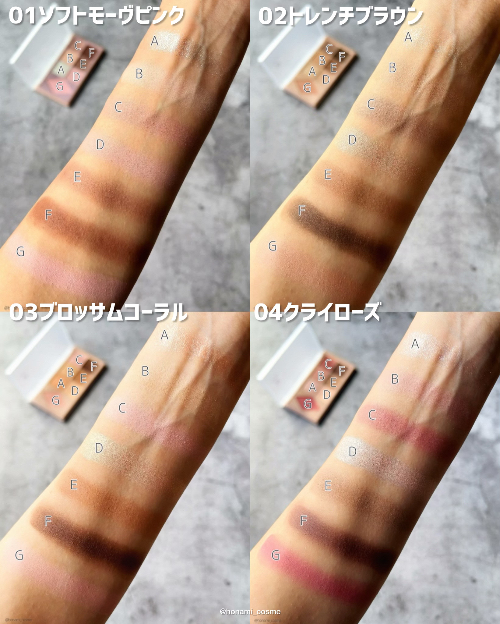 - <01 ソフトモーブピンク> マイカ、タルク、合成フルオロフロゴパイト、ジメチコン、トリエチルヘキサノイン、リンゴ酸ジイソステアリル、イソステアリン酸水添ヒマシ油、酸化鉄、酸化チタン、窒化ホウ素、ポリグリセリル-3ポリジメチルシロキシエチルジメチコン、ラウリン酸亜鉛、シリカ、ホウケイ酸(Ca/Al)、ステアリン酸ソルビタン、グンジョウ、メチルパラベン、赤226、銀、水酸化Al、赤202、酸化スズ、トコフェロール、スクワラン、ホホバ種子油 <02 トレンチブラウン> マイカ、タルク、合成フルオロフロゴパイト、トリエチルヘキサノイン、ジメチコン、酸化鉄、イソステアリン酸水添ヒマシ油、リンゴ酸ジイソステアリル、酸化チタン、窒化ホウ素、ポリグリセリル-3ポリジメチルシロキシエチルジメチコン、ラウリン酸亜鉛、シリカ、ホウケイ酸(Ca/Al)、メチルパラベン、ステアリン酸ソルビタン、グンジョウ、銀、水酸化Al、酸化スズ、トコフェロール、スクワラン、ホホバ種子油、赤226 <03 ブロッサムコーラル> 合成フルオロフロゴパイト、タルク、マイカ、ジメチコン、トリエチルヘキサノイン、酸化鉄、リンゴ酸ジイソステアリル、酸化チタン、イソステアリン酸水添ヒマシ油、窒化ホウ素、ポリグリセリル-3ポリジメチルシロキシエチルジメチコン、ラウリン酸亜鉛、ホウケイ酸(Ca/Al)、シリカ、ステアリン酸ソルビタン、メチルパラベン、グンジョウ、銀、赤226、水酸化Al、酸化スズ、トコフェロール、スクワラン、ホホバ種子油 <04 クライローズ> 合成フルオロフロゴパイト、タルク、マイカ、ジメチコン、リンゴ酸ジイソステアリル、トリエチルヘキサノイン、酸化鉄、イソステアリン酸水添ヒマシ油、酸化チタン、窒化ホウ素、ポリグリセリル-3ポリジメチルシロキシエチルジメチコン、ラウリン酸亜鉛、ホウケイ酸(Ca/Al)、シリカ、グンジョウ、ステアリン酸ソルビタン、メチルパラベン、赤202、赤226、銀、水酸化Al、トコフェロール、スクワラン、ホホバ種子油、コンジョウ、酸化スズ、金