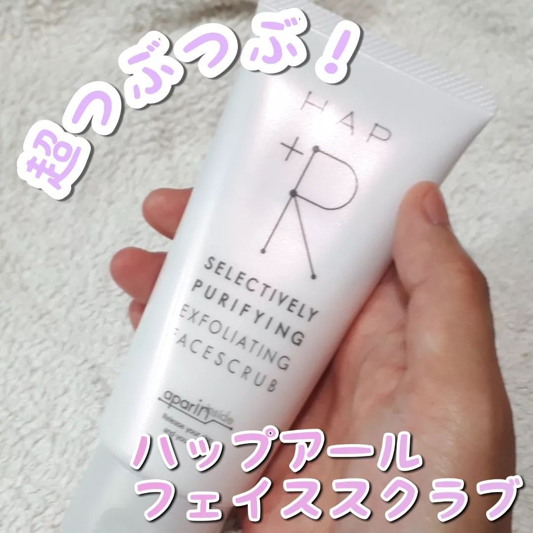 ハップアールのスクラブ粒子(スキンケア用アパタイト)は「悪玉皮脂」を選んで吸着、「善玉皮脂」は残すからさっぱり・つるつるなのにうるおいが残るそう! フェイススクラブら「@cosmeベストコスメアワード2024年ベストゴマージュ・ピーリング部門第2位」!!だそう はっきり見えるスクラブ粒子。スクラブがしっかりコロコロしてるので優しく馴染ませてます。