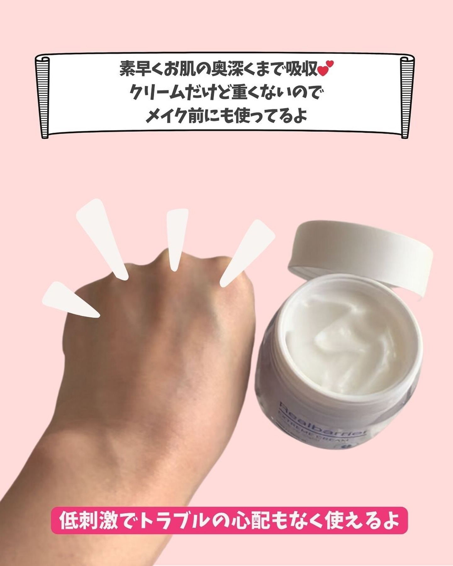 独自開発特許成分オメガセラミド パンテノール2.9%配合で肌の中の水分を満たし刺激を受けた肌を落ち着かせる肌バリア強化水分鎮静クリーム こっくりしてるけどべたつかないクリームだから一年中使用可能 敏感肌使用適合テスト ノンコメド ジェニックテスト済みなので敏感肌の人も試して欲しい✨️