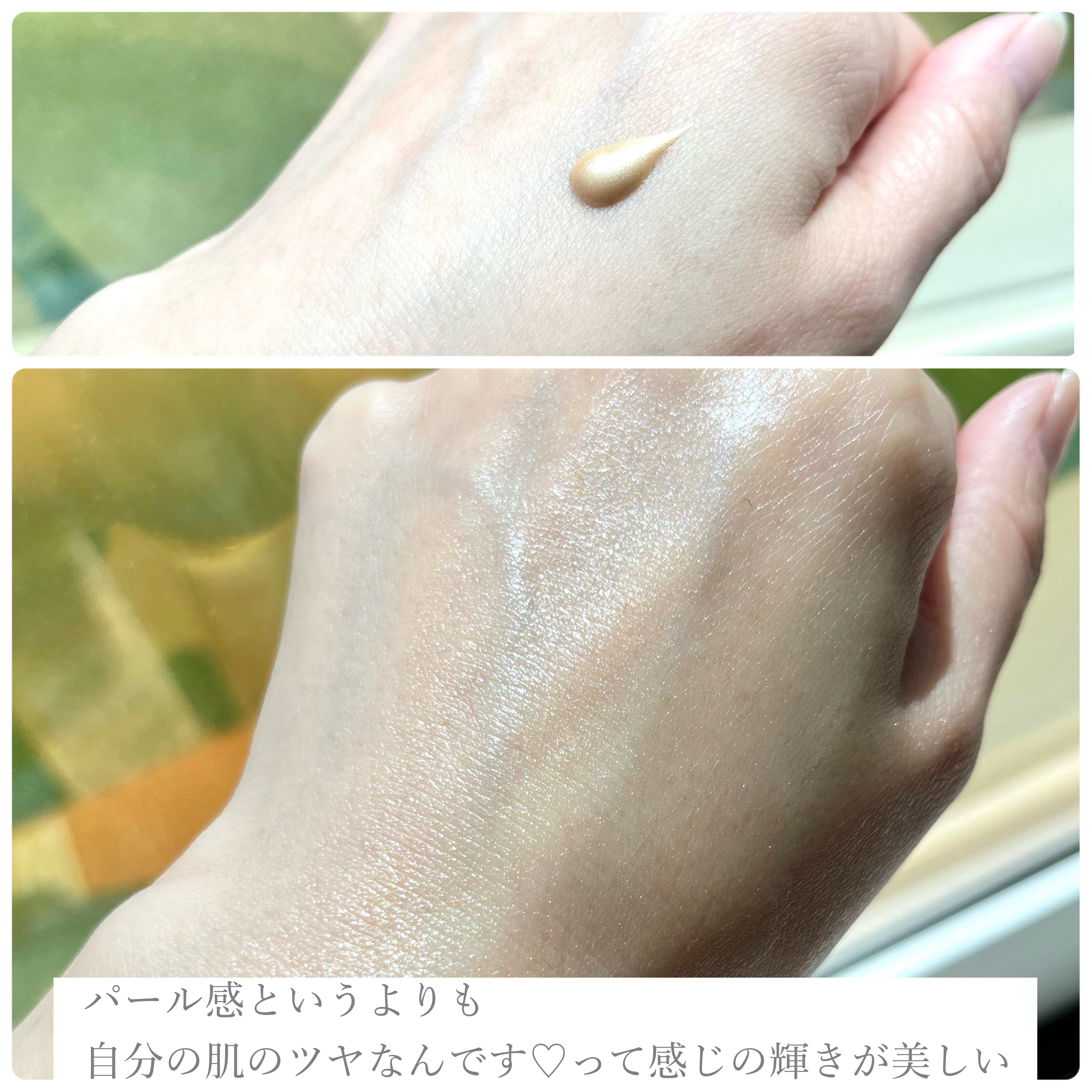 スキンケアとメイクアップを融合させた新感覚アイテム!肌にゴールドのツヤをもたらしつつ、自然なトーンアップ感で明るさもプラスしてくれます。 みずみずしい輝きでデイリー使いにも凄く良いです。保湿セラムとしても、化粧下地やハイライターとしてもいろんな使い方ができます。 とても軽いテクスチャーでベタつかず自然に馴染む感じが心地いいです。