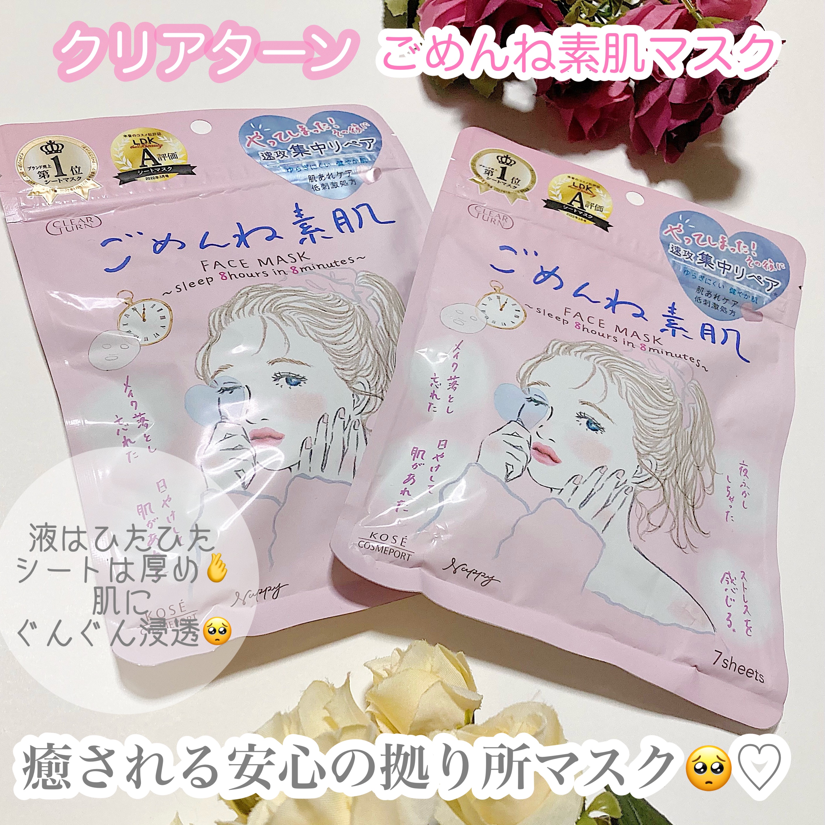 - 【クリアターン ごめんね素肌マスク】 負担をかけて、あれてしまった肌の素肌環境※1をととのえる“速攻集中リペア※2マスク”です。 ① あれがちな肌を素早くコンディションケア! ザクロエキス、桜エキス※3、ウメ果実エキスBG配合し、ゆらぎやすい肌環境をととのえ、肌あれをケアします。また、うるおいケア成分として、ヒアルロン酸、白キクラゲ多糖体BGを配合。外的ストレス※4や不規則な生活の影響を受けやすい肌も健やかでゆらぎにくい肌へみちびきます。 ②敏感肌も使える、弱酸性・低刺激処方 無香料・無着色・無鉱物油・アルコールフリー(エチルアルコール)・パラベンフリー・紫外線吸収剤フリー・シリコーンフリー・パッチテスト済み・アレルギーテスト済み・スティンギングテスト済み・敏感肌自覚者による連用テスト済み(すべての方にアレルギーや皮膚刺激が起きない、刺激感がないというわけではありません。すべての方の肌に合うということではありません。) ③角質ケアもできる!凸凹高密着シート コットン生まれのやわらかな肌触りのベンリーゼを使用。 表面に凸凹のエンボス加工を施しているため、密着性が高く、はがしたマスクでやさしく顔をふきとることで角質ケアもできます。 ※1 うるおい環境のこと ※2 うるおいお手入れのこと ※3 ソメイヨシノ葉エキス、ウメ果実エキスBGはウメ果実エキス・BG(保湿) ※4 乾燥による刺激のこと
