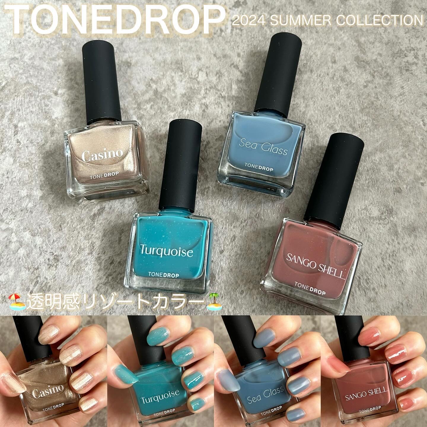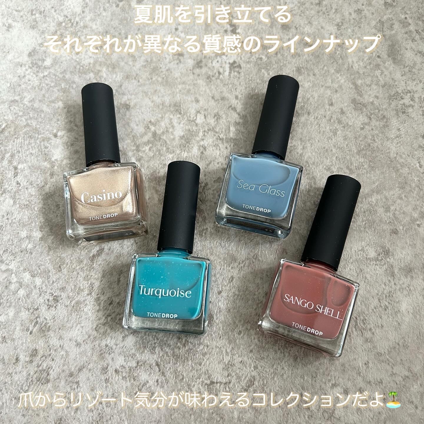 リゾートカラーが新登場! リゾートの景色と、 太陽に照らされた波間を閉じ込めたような 多彩なきらめきが楽しめる☀️🌊 今回の新色は4色展開なんだけど カラーごと質感が違うの! 037 Casinoはラメメインのホワイトゴールド系で こういう色がアクセントカラーとして 一番使いやすい🥇 038 Turquoiseには珍しい形の 繊細ホログラムが配合されてるよ💎 040 Sango Shellは肌が綺麗に見えるサンゴカラーに ゴールドの超微細パール入り🪸