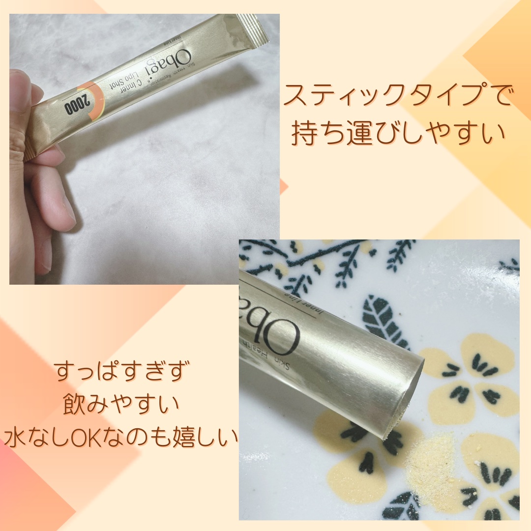- オバジが提案する飲む“ビタミンC”。オリジナルのリポショットC*を配合し、すばやく届けることを目指し開発した顆粒タイプ。内側からハリとうるおいのある毎日を応援し、透き通るような美しさをサポートします。 <オバジ独自の研究により内側にアプローチ> 1. オバジ独自のリポショットC*。ビタミンCを1日(目安量)当たり2000mg配合。 2. 美容サポート成分のコラーゲンペプチド、コラプラス®に加え、ツボクサエキス、ヒハツエキス配合。 3. 毎日続けていただくために、水なしでもお召し上がりいただけるよう味やくちどけにこだわりました。 ・グレープフルーツ風味 ・顆粒タイプ ・ノンカフェイン *ビタミンC、ヒマワリレシチン、ウコンエキス、加工デンプン、加工油脂