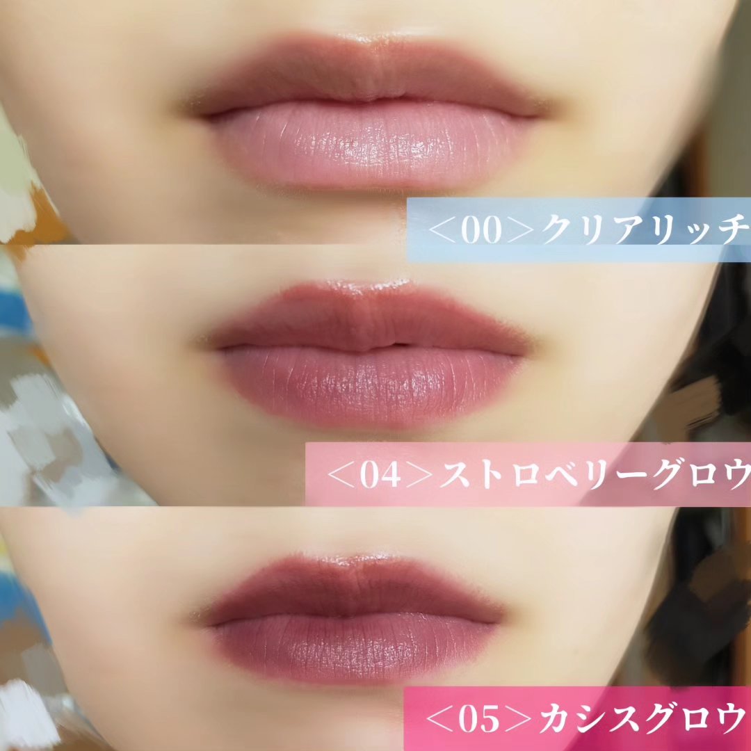 - <00 クリアリッチ> トリメリト酸トリトリデシル、ポリイソブテン、リンゴ酸ジイソステアリル、マイクロクリスタリンワックス、ホホバ種子油、セレシン、イソノナン酸イソノニル、ビスジグリセリルポリアシルアジペート-2、エチルヘキサン酸セチル、ポリエチレン、ヒアルロン酸Na、加水分解コラーゲン、スクワラン、アロエベラ葉エキス、アロエベラ花エキス、ウコン根エキス、カミメボウキ葉エキス、コクシニアインディカ果実エキス、サンゴモエキス、ナス果実エキス、メボウキ花/葉エキス、メリアアザジラクタ葉エキス、メリアアザジラクタ花エキス、ローズマリー葉エキス、アボカド油、アマ種子油、アルガニアスピノサ核油、オリーブ果実油、ヒマワリ種子油、マカデミア種子油、ヤシ油、ミネラルオイル、酢酸トコフェロール <04 ストロベリーグロウ> トリメリト酸トリトリデシル、ポリイソブテン、リンゴ酸ジイソステアリル、マイクロクリスタリンワックス、ホホバ種子油、セレシン、イソノナン酸イソノニル、ビスジグリセリルポリアシルアジペート-2、エチルヘキサン酸セチル、ポリエチレン、ヒマワリ種子油、ヤシ油、アマ種子油、アボカド油、アルガニアスピノサ核油、マカデミア種子油、オリーブ果実油、ローズマリー葉エキス、酢酸トコフェロール、スクワラン、アロエベラ葉エキス、ミネラルオイル、ヒアルロン酸Na、加水分解コラーゲン[+/-]酸化チタン、赤201、青1、酸化鉄、マンガンバイオレット、赤202、黄4 <05 カシスグロウ> トリメリト酸トリトリデシル、ポリイソブテン、リンゴ酸ジイソステアリル、マイクロクリスタリンワックス、ホホバ種子油、セレシン、イソノナン酸イソノニル、ビスジグリセリルポリアシルアジペート-2、エチルヘキサン酸セチル、ポリエチレン、ヒマワリ種子油、ヤシ油、アマ種子油、アボカド油、アルガニアスピノサ核油、マカデミア種子油、オリーブ果実油、ローズマリー葉エキス、酢酸トコフェロール、スクワラン、アロエベラ葉エキス、ミネラルオイル、ヒアルロン酸Na、加水分解コラーゲン[+/-]酸化チタン、赤201、青1、酸化鉄、マンガンバイオレット、赤202、黄4 <06 ドライローズグロウ> トリメリト酸トリトリデシル、ポリイソブテン、リンゴ酸ジイソステアリル、マイクロクリスタリンワックス、ホホバ種子油、セレシン、イソノナン酸イソノニル、ビスジグリセリルポリアシルアジペート-2、エチルヘキサン酸セチル、ポリエチレン、ヒマワリ種子油、ヤシ油、アマ種子油、アボカド油、アルガニアスピノサ核油、マカデミア種子油、オリーブ果実油、ローズマリー葉エキス、酢酸トコフェロール、スクワラン、アロエベラ葉エキス、ミネラルオイル、ヒアルロン酸Na、加水分解コラーゲン[+/-]酸化チタン、赤201、青1、酸化鉄、マンガンバイオレット、赤202、黄4 <07 クランベリーグロウ> トリメリト酸トリトリデシル、ポリイソブテン、リンゴ酸ジイソステアリル、マイクロクリスタリンワックス、ホホバ種子油、セレシン、イソノナン酸イソノニル、ビスジグリセリルポリアシルアジペート-2、エチルヘキサン酸セチル、ポリエチレン、ヒマワリ種子油、ヤシ油、アマ種子油、アボカド油、アルガニアスピノサ核油、マカデミア種子油、オリーブ果実油、ローズマリー葉エキス、酢酸トコフェロール、スクワラン、アロエベラ葉エキス、ミネラルオイル、ヒアルロン酸Na、加水分解コラーゲン[+/-]酸化チタン、赤201、青1、酸化鉄、マンガンバイオレット、赤202、黄4
