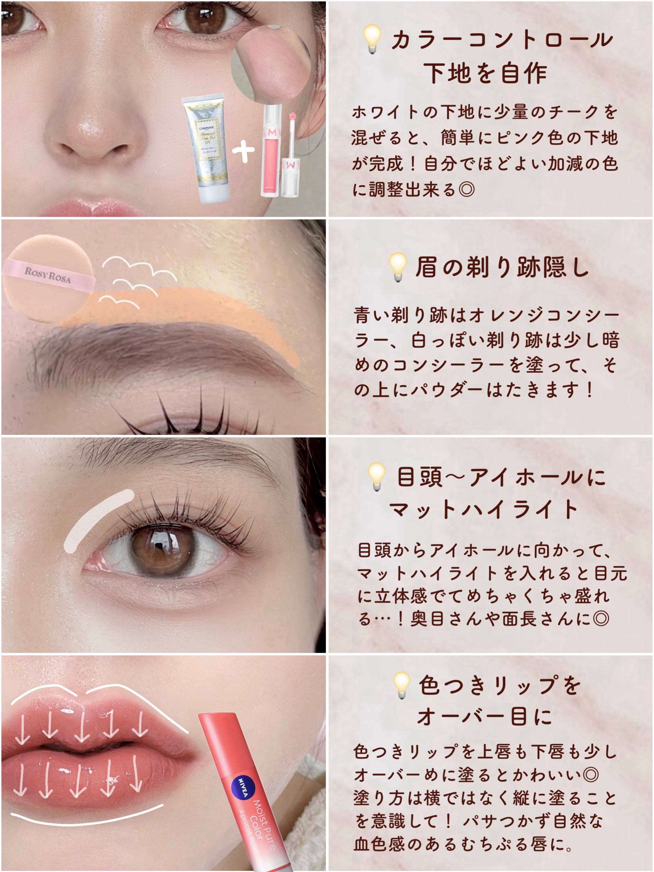 やり方は画像を見てみてください! よりぷっくりさせたい方は、最後にコンシーラーの1番左のカラーを涙袋に塗ると◎ 黄味がかったアイシャドウが似合わない方は01番の方がいいかもしれないです。 ラメを使わない完全マットなので、ナチュラルメイクやスクールメイクにもおすすめ✨
