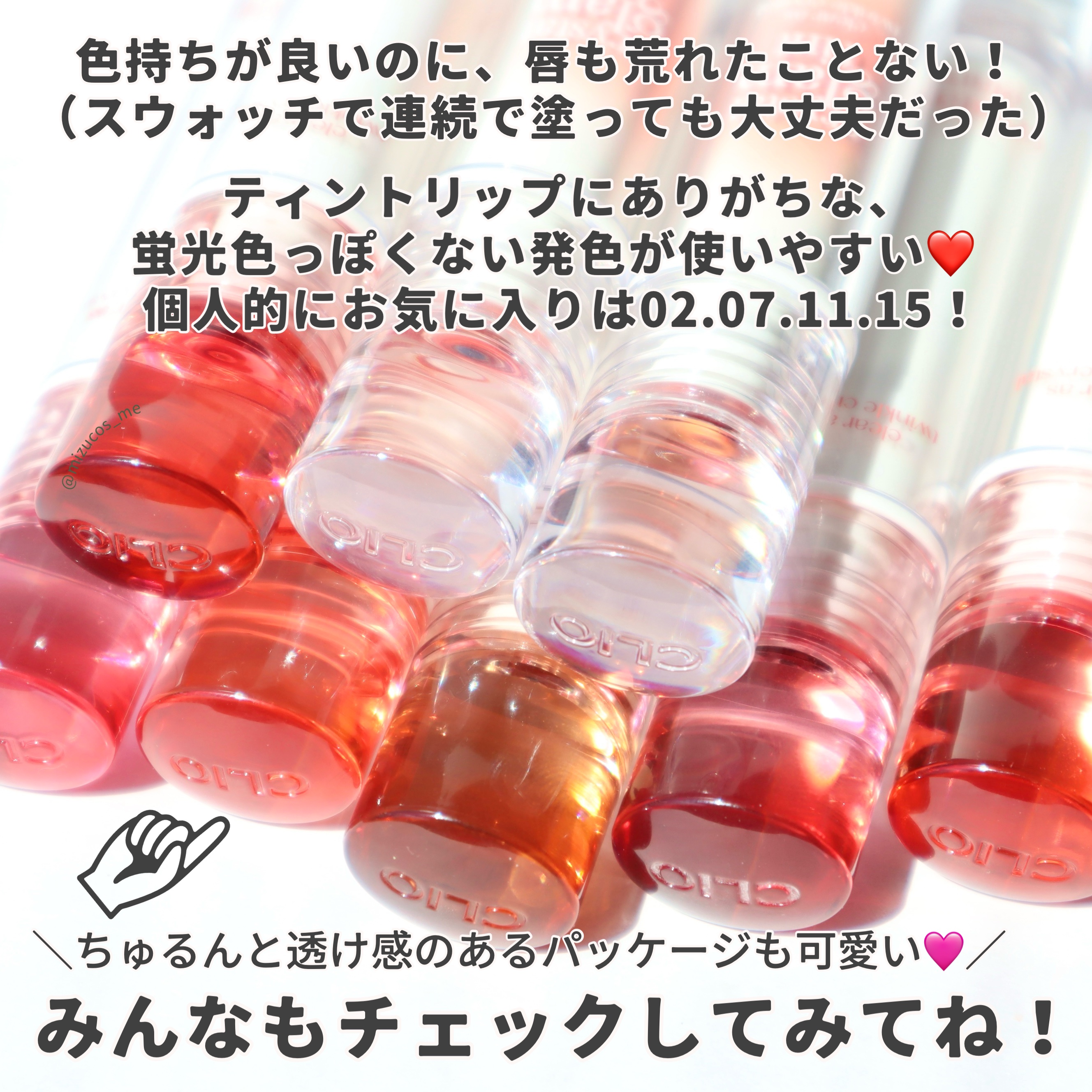 結論、なんでバズってないのか 私には理解できないくらいに良い🙆♀️ まず見た目が大優勝ね🏅 飴ちゃんみたいに透き通った色が めちゃくちゃ綺麗じゃない?? ずっと見てられる✨✨ もちろんリップとしての性能も優秀🏆 個人的にめっちゃ好きな ヒンスのムードインハンサーウォーターリキッドグロウ のむちっとした質感と LaKaのフルーティーグラムティントの 透け艶な感じを合わせた感じ!! 色もどれも可愛くて、私はイエベなので 青みが少ない色を選んだけど 全部で8色あるよ!!! 一番お気に入りは 002 サマーアプリコット🍑 まじで可愛い色だから使ってみて欲しい!!