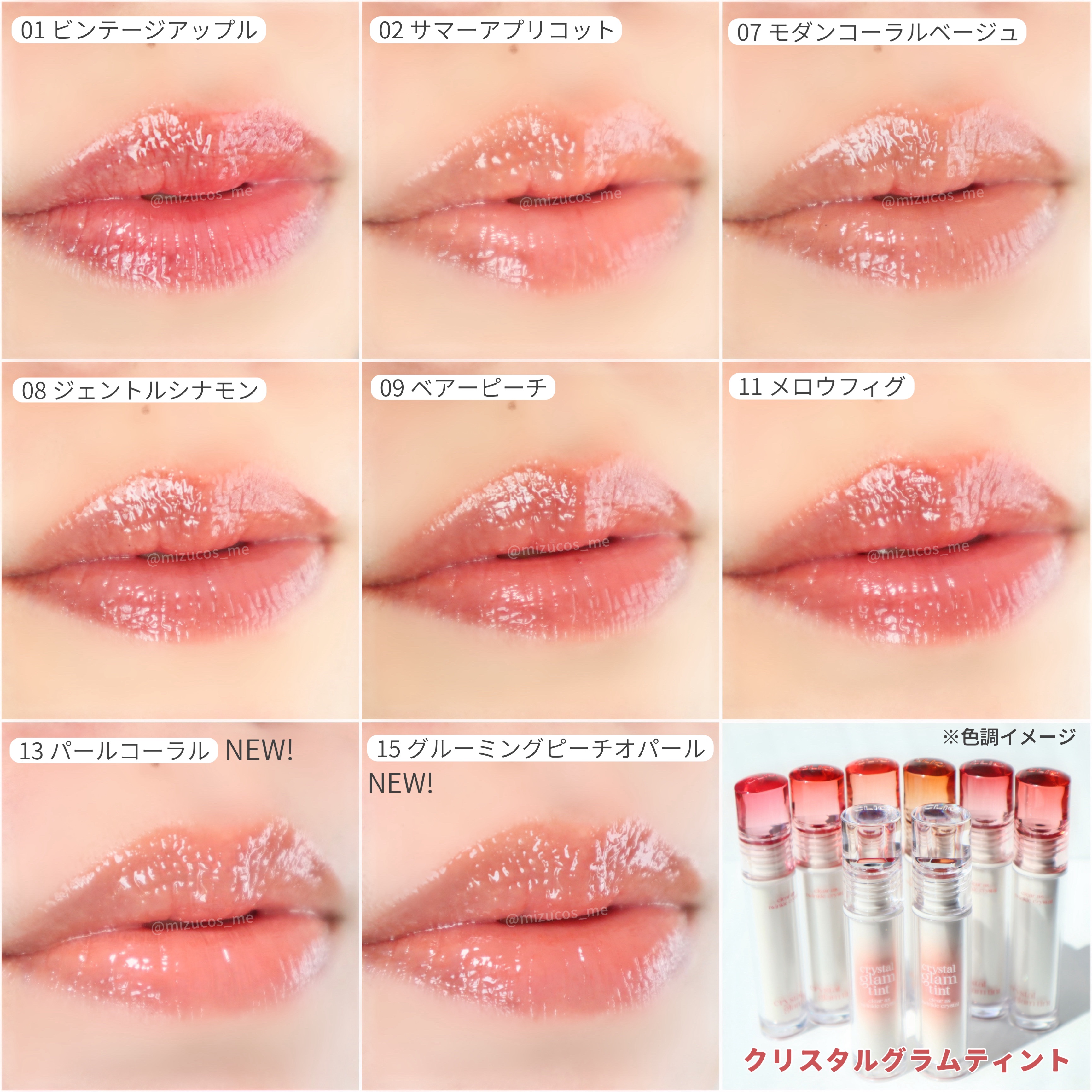 - ※ご覧いただく環境(端末・モニター設定など)により、商品の実際の色味と印象が異なることがございます。 太陽に照らされたガラス玉のように透き通った輝き満ちる クリスタルグラムティント <19 ベビーアップル> クリアに熟したコーラルカラーのリンゴ <20 バニラアップル> バニラを一滴混ぜた淡い色合いのリンゴ <25 ダークチェリー> よく熟して深みを増したブラックカラーのチェリー <26 モーブチェリー> 深くやわらかく煮詰めたモーブカラーのチェリー <27 ハニーチェリー> ほのかに黄みがかったヘルシーカラーのチェリー <28 ドライチェリー> ほんのり日焼けしたレッドブラウンカラーのチェリー