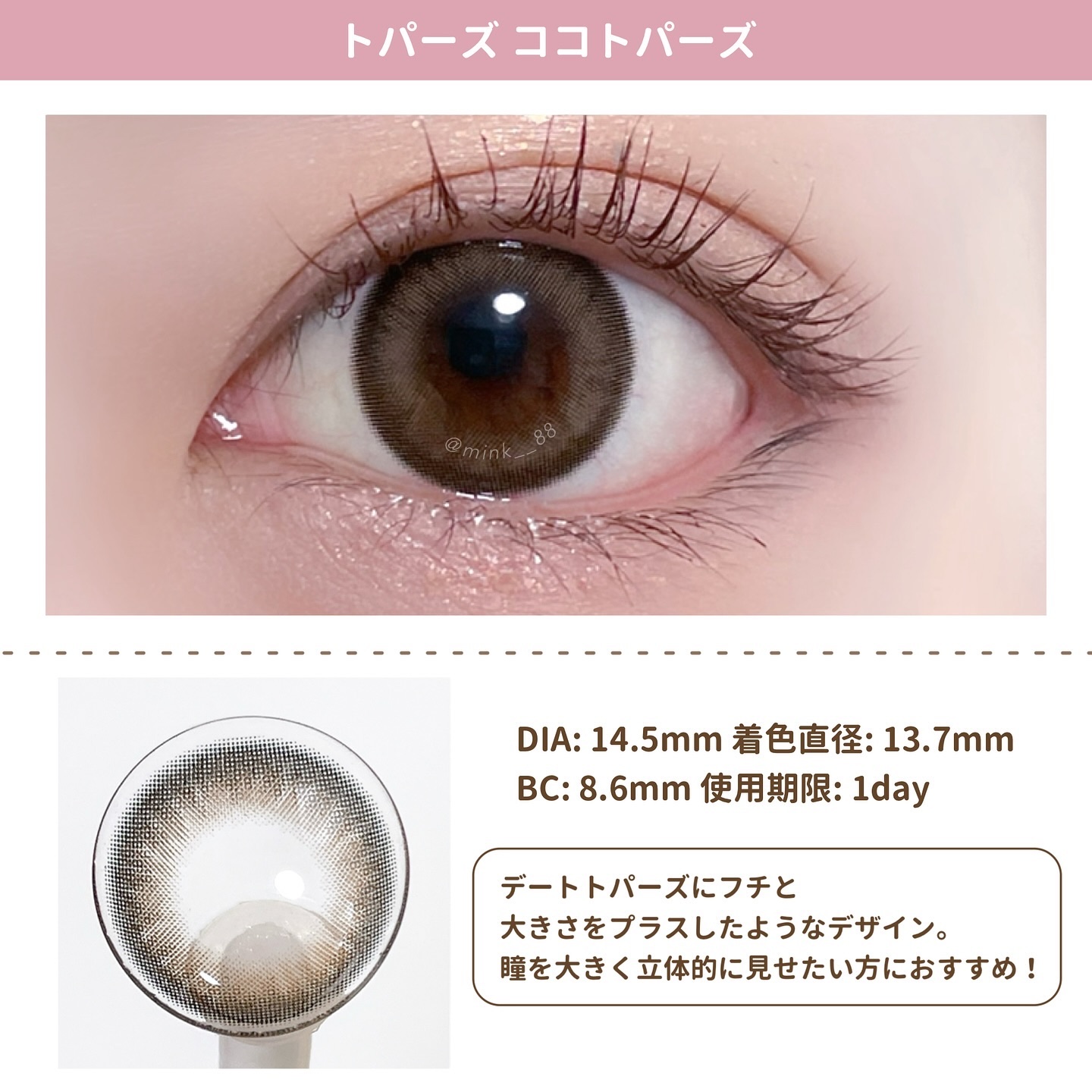 ほんのりピンクにブラウンのフチ デザインもナチュラルでふんわり盛れる🤍 くすみピンクと大きめのグラフィックで ガーリーな雰囲気に🎀 くすんだアッシュ系で垢抜けた瞳に♡ 透明感のある儚げなピンク♡ ピンク初心者さんにもおすすめ!