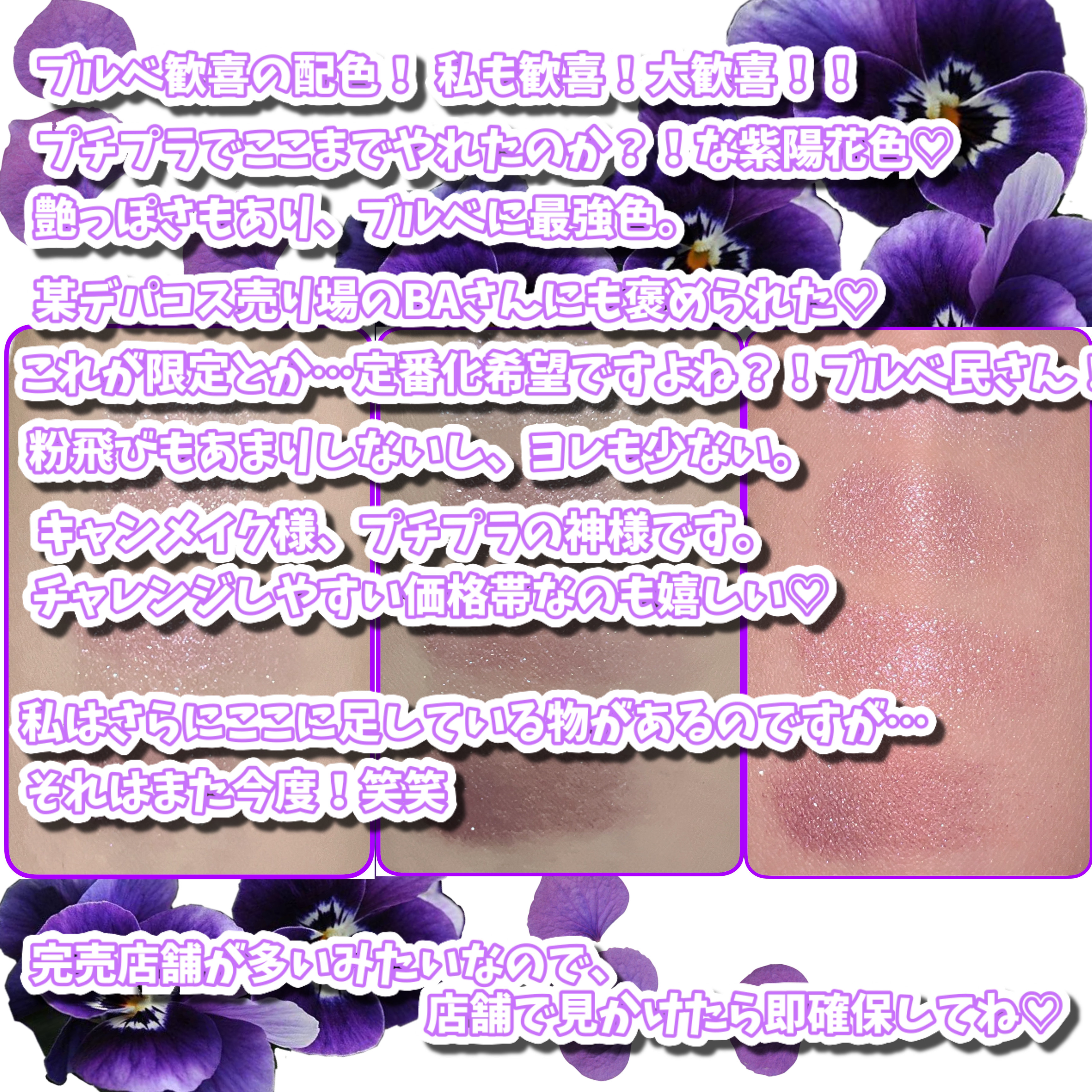 キツすぎない紫のアイシャドウです💜 さらさらなのにしっとり系の粉で粉飛びもしにくくプチプラでここまで出来るのかと感動✨ そのくらいいい色🥰 おまけにその日は朝メイクしてお出かけしたけど夜までヨレてなかった‼️