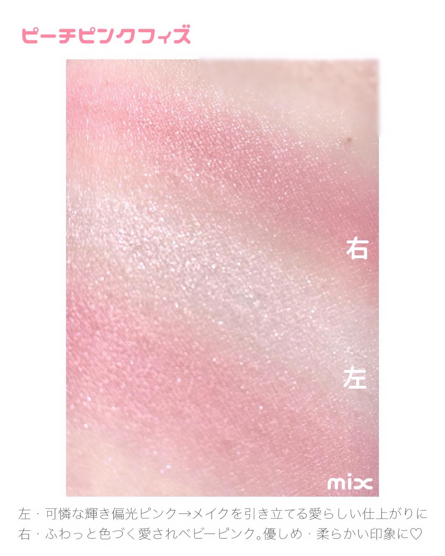 チークは発色強めで ブラシで載せるとふんわり血色感出せてよかった! ハイライト付きなんだけど、オレンジとピンクで ハイライトも少し輝きが違うみたい!! ピーチピンクフィズ アプリコットフィズ