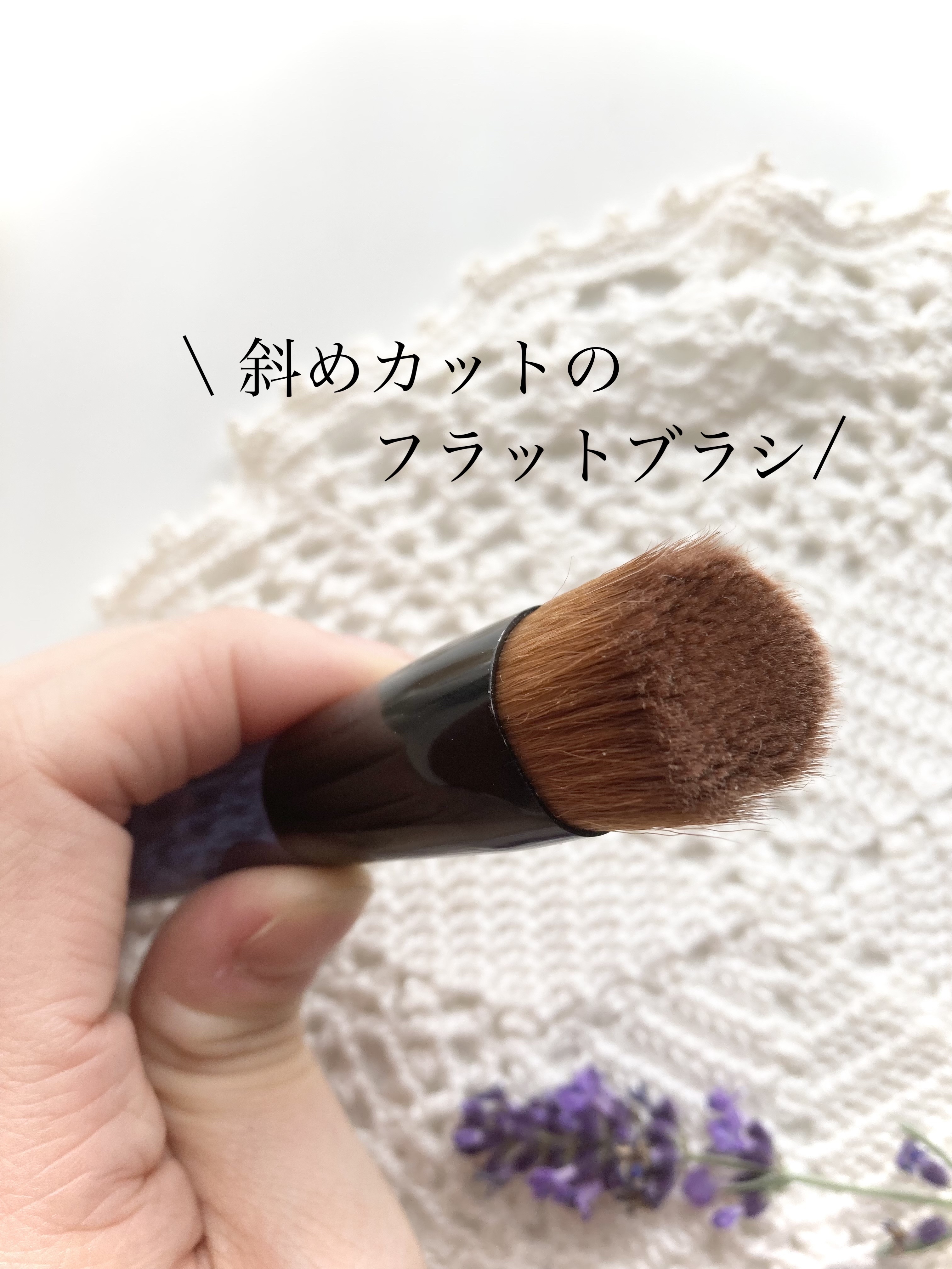 - メイクアップアーティストの仕上がりを徹底分析。 毛の質・長さ・斜めフラット面の3つの効果で、完成度の高い美肌をテクニックフリーで実現するファンデーションブラシ。 パウダリー・リキッド・クリーム・固型乳化タイプのファンデーション用ブラシです。 しなやかに肌にフィットする心地よい使用感触です。 専用ケース付き。 使用方法 ●毛の長い方を上にし、鉛筆を持つようにブラシを握って使用します。 <パウダリー・固型乳化タイプのファンデーションの仕上げ方> 1.ファンデーションの表面を3回程度軽くタッチしてブラシに含ませ、しっかりカバーゾーンにトントンとおくようになじませます。 ※同じ動作を片側2~3回を目安に繰り返し、カバーします。 2.ファンデーションを①のようにとり、適度にカバーゾーンを軽くおさえるようになじませます。目のまわりはブラシを左右に動かし塗布します。 3.薄ぬりゾーンは、フェイスラインに向かってブラシを動かしなじませます。 <リキッド・クリームタイプのファンデーションの仕上げ方> 1.手のひらにファンデーションを適量とり、指先で顔の4ヶ所におきます。 2.パウダリー・固型乳化タイプのファンデーションの仕上げ方と同じ順序で仕上げます。